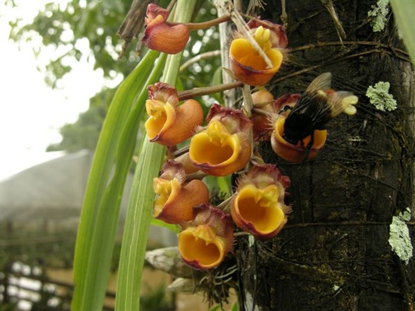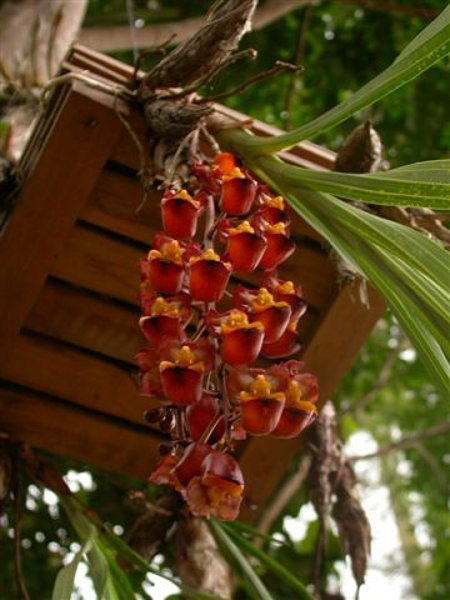 Found in French Guiana, Guyana, Surianm, Venezuela, Peru and northern Brazil on trees on banks of slow moving rivers and streams at elevations of 100 to 700 meters as a large sized, pendant and hot to warm growing epiphyte with fusiform, cylindrical, slightly compressed pseudobulbs carrying linear-ligulate, 3 nerved, plicate, acute leaves that blooms in the spring as the new growths arise on a basal, pendent, 10 to 15" [20 to 30 cm] long, to 20 flowered inflorescence arising on a just maturing pseudobulb with mostly male flowers but the basal few may be female with the ones in between being hermaphroditic.