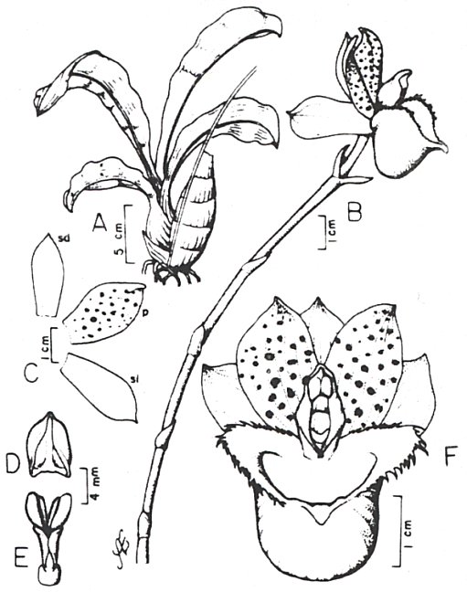 Found in Para state of Brazil as a small sized, hot growing epiphyte with fusiform pseudobulbs carrying several plicate, elliptic-lanceolate, basally clasping leaves that blooms on an erect few flowered inflorescence.