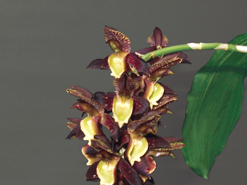 Found in Para' state of Brazil at elevations around 40 meters as a medium sized, hot growing epiphyte with oblong-fusiform, several noded, erect, becoming rugose and sulcate with age pseudobulbs carrying oblong-lanceolate, undulate margins, plicate with prominent veined leaves that blooms in the late spring on a male, lateral, slightly arcuate, rigid, 6" [15 cm] long, densely many flowered inflorescence with amplexicaul, acute, white floral bracts and carrying non resupinate flowers.