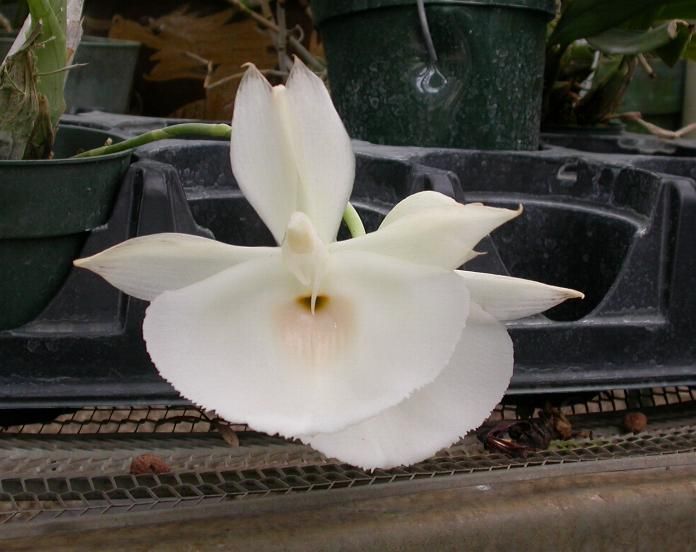 Found in Venezuela, Colombia and Ecuador in lowland forest at elevations around 100 to 200 meters with tropical conditions with a long wet period and a short dry season as a large sized, hot growing epiphytic species with clustered, fusiform-ovoid, several noded pseudobulbs that are enveloped by several leaf bearing sheaths carrying distichous, lanceolate, suberect, plicate leaves and blooms in the spring and summer on a basal, erect to pendant, 12" [30 cm] long, several to many [4 to 10] flowered, racemose inflorescence carrying fragrant flowers that open very flat and arise on a mature pseudobulb.