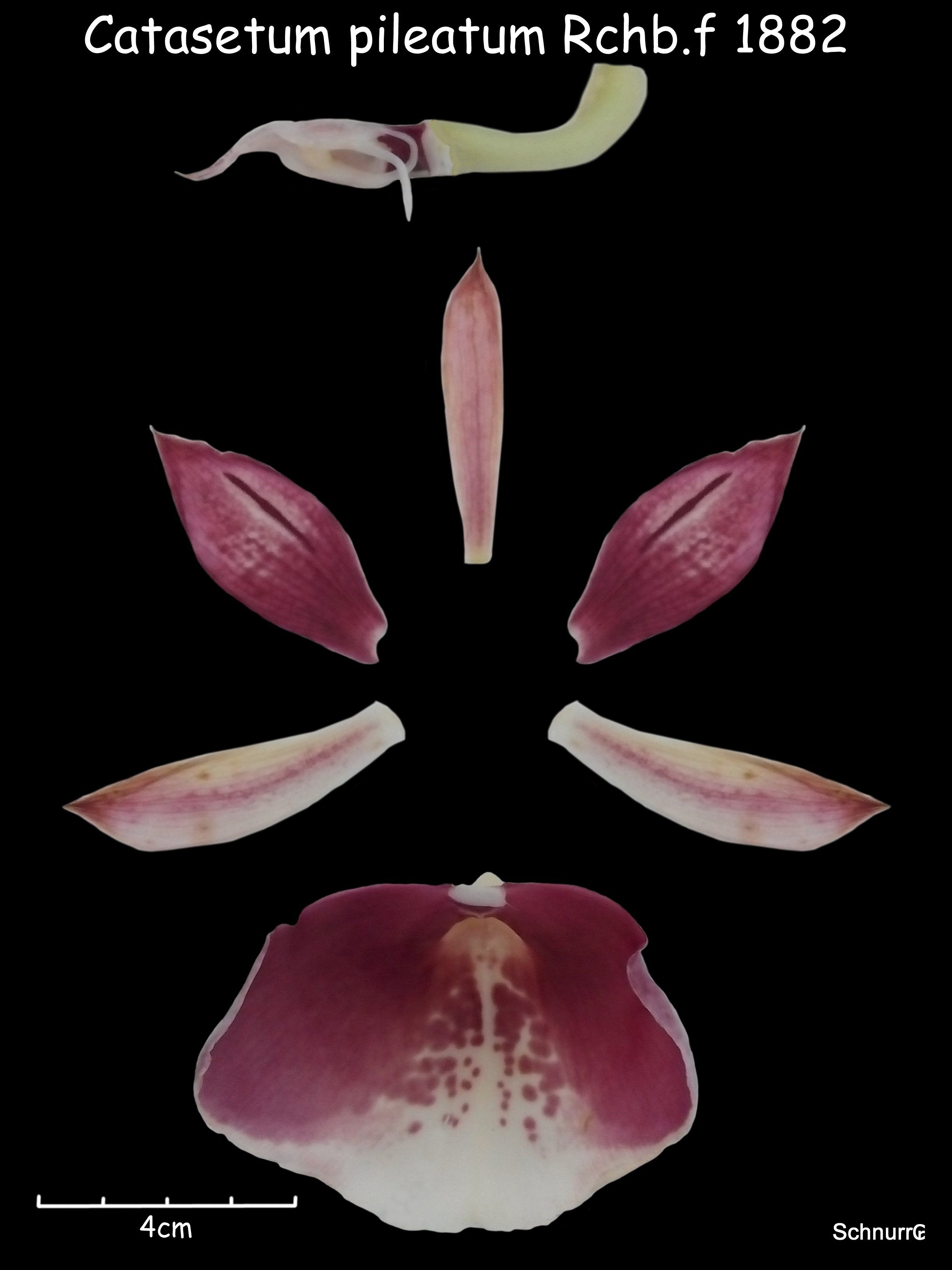 References W3 Tropicos, Kew Monocot list , IPNI ; Symbolae Antillanae Vol VI Orchidaceae Urban 1909; Die Orchideen Schlechter 1915; Flora Brasilica Vol XII VI Hoehne 1942 drawing fide; Flora Brasilica Vol XII VI Hoehne 1942 as C pileatum var album; Flora Brasilica Vol XII VI Hoehne 1942 as C pileatum var aurantiacum; Flora Brasilica Vol XII VI Hoehne 1942 as C pileatum var lindeni; Flora Brasilica Vol XII VI Hoehne 1942 as C pileatum var pottsianum; Flora Brasilica Vol XII VI Hoehne 1942 as C pileatum var randi; Flora Brasilica Vol XII VI Hoehne 1942 as C pileatum var regale; Iconografia de Orchidaceae Do Brasil Hoehne 1949 drawing fide; AOS Bulletin Vol 26 No 10 1957 drawing fide; AOS Bulletin Vol 27 No 9 1958 drawing good; Venezuelan Orchids Illustrated Vol 1 Dunsterville & Garay 1959 drawing fide; AOS Bulletin Vol 29 No 8 1960 photo ok; Native Orchids of Trinidad Schultes 1960; AOS Orchid Culture 1963 photo fide; Encyclopedia of Cultivated Orchids Hawkes 1965 photo fide; AOS Bulletin Vol 36 #3 1967 photo fide; AOS Bulletin Vol 36 # 9 1967; AOS Bulletin Vol 39 No 8 1970 photo fide; Flora de Venezuela Volumen XV Part 4 Foldats 1970 drawing fide; AOS Bulletin Vol 44 #8 1975 as C pileatum var aureumphoto fide; Orchidaceae Brasilensis band 1 Pabst & Dungs 1976 drawing fide; Orchidaceae Brasilensis band 1 Pabst & Dungs 1976 as C pileatum var bungerothii drawing fide; The Orchids of Venezuela, An Illustrated Field Guide Vol 1 Dunsterville and Garay 1979 drawing fide; AOS Bulletin Vol 49 NO 1 1980 photo fide; An Illustrated Encyclopedia of Orchids Pridgeon 1982; AOS Bulletin Vol 52 No 7 1983 photo fide; AOS Bulletin Vol 56 No 5 1987 photo fide; Venezuelan Orchids Dunsterville 1987 drawing/photo fide; Native Colombian Orchids Vol 1 COS 1990 photo fide; Orchids Travel By Air A Pictoral Safari Mulder, Mulder-Roelfsema and Schuiteman 1990 photo fide; AOS Bulletin Vol 60 No 4/118 1991 photo fide; The Manual of Cultivated Orchids Bechtel, Cribb and Laurent 1992 photo fide; Rudolf Schlechter Die Orchideen Band 1B lieferung 26 1584 - 1648 Brieger 1992 photo fide; Orchids of Brazil McQueen 1993 photo fide; AOS Bulletin Vol 64 No 10 1995 photo; Manual of Orchids Stewart 1995; Orchid Digest Vol 60 #4 1996 photo fide; AOS Bulletin Vol 65 No 10 1996 as C pileatum var aurianticum photo fide; Venezuela, Paraiso de Orquideas Romero 1997 photo fide; Venezuela; Paraiso de Orquideas Romero 1997 as C pileatum var imperialis photo fide; AOS Bulletin Vol 67 No 7 1998 photo fide; The World Of Catasetum Holtz 1999 photo fide; AOS Bulletin Vol 68 #5 1999 photo fide; Orchids of Venezuela [An illustrated field guide] Vol. 1 Ramiro and Carnevali 2000 drawing fide; Orquideologia Vol 22 #2 2002 photo fide; Australian Orchid Review Vol 68 No 1 2003 photo; Flora of the Venezuelan Guayana Vol 7 Steyermark, Berry, Yatskievych and Holst 2003 drawing ok; AOS Bulletin Vol 73 #1 2004 photo fide; AOS Bulletin Vol 74 No 10 2005 photo fide; The World's Most Beautiful Orchids Allikas & Nash 2005 photo fide; Genera Orchidacearum Vol 5 Part 2 Pridgeon, Cribb Chase and Rasmussen 2009 Male/Female photo fide; AOS Bulletin Vol 81 #3 2012 photo fide; AOS Bulletin Vol 84 #4 2015 photo fide; Orchid Digest Vol 80 #4 2016 photo fide; Orchid Digest Vol 80 #4 2016 female flower photo fide; AOS Bulletin Vol 85 #9 2016 photo fide; AOS Bulletin Vol 88 # 1 2019 photo fide; AOS Bulletin Vol 88 #10 2019 drawing fide; Orchids, A Colombian Treasure Vol 1 Ortiz & Uribe 2014 drawing/photo fide