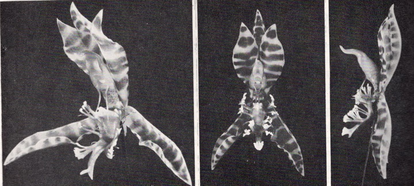 Found in Amazonas Brazil as a medium sized, hot to warm growing epiphyte with elliptic, noded pseudobulbs carrying up to 6, plicate, elliptic, acute, narrowing below into the clasping pseudopetiolate base leaves that blooms on a basal, erect, 7.2 to 8.8" [18 to 22 cm] long, stout, green, several flowered inflorescence