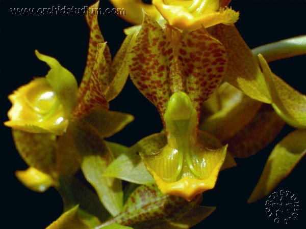 Found in Santa Catarina state of Brazil in the coastal Atlantic Forest as a medium sized, warm growing epiphyte with fusiform to subconical, curved pseudobulbs carrying 6, elliptic-lanceolate to oblanceolate, plicate, 3 nerved leaves that blooms in the spring on a pendant, to 20" [50 cm] long, 18 to 24 flowered inflorescence holding the flowers towards the apical half.