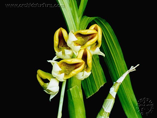 Found in Mato Grosso state, Brazil and Bolivia in savannahs at elevations around 400 meters on palm trees along rivers as a medium sized, hot growing epiphytic species with fusiform, some curved pseuduobulbs carrying linear-lanceolate, plicate leaves that blooms in the fall and early winter on a basal, erect to pendant, 8"+ [20+ cm] long, racemose, several [6] flowered inflorescence arising on leafless mature pseudobulbs.