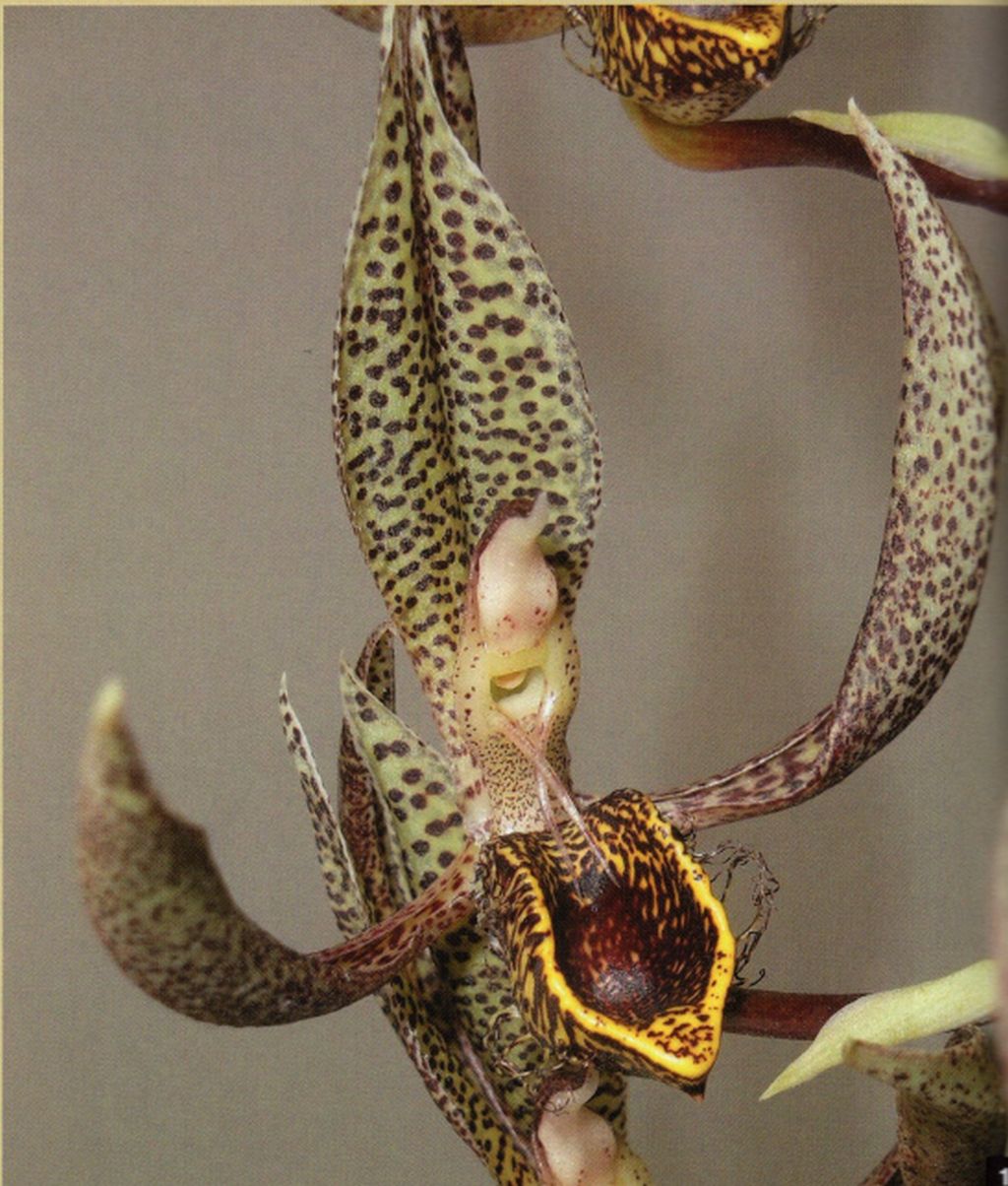 Found in San Martin department of Peru at eelvations around 1500 meters as a medium sized, cool growing epiphyte with fusiform, swollen several noded pseudobulbs enveloped by fugacious leaf sheths and carrying 5 to 8, thin, deciduous, plicate, elliptic-lanceolate, acute, prominently veined beneath,, gradually narrowing below into the petioalte base leaves that blooms in the winter on a basal, or on the first 2 internodes of the pseudobulb, erect to arching, to 16" [40 cm] long, to 8 flowered male inflorescence with narrow, triangular, acute floral bracts. The female inflorescence is erect, to 12" [30 cm] long, thicker than the male inflorescnece, 3 to 5 flowered inflorescence carrying non-resupinate, pistillate flowers.