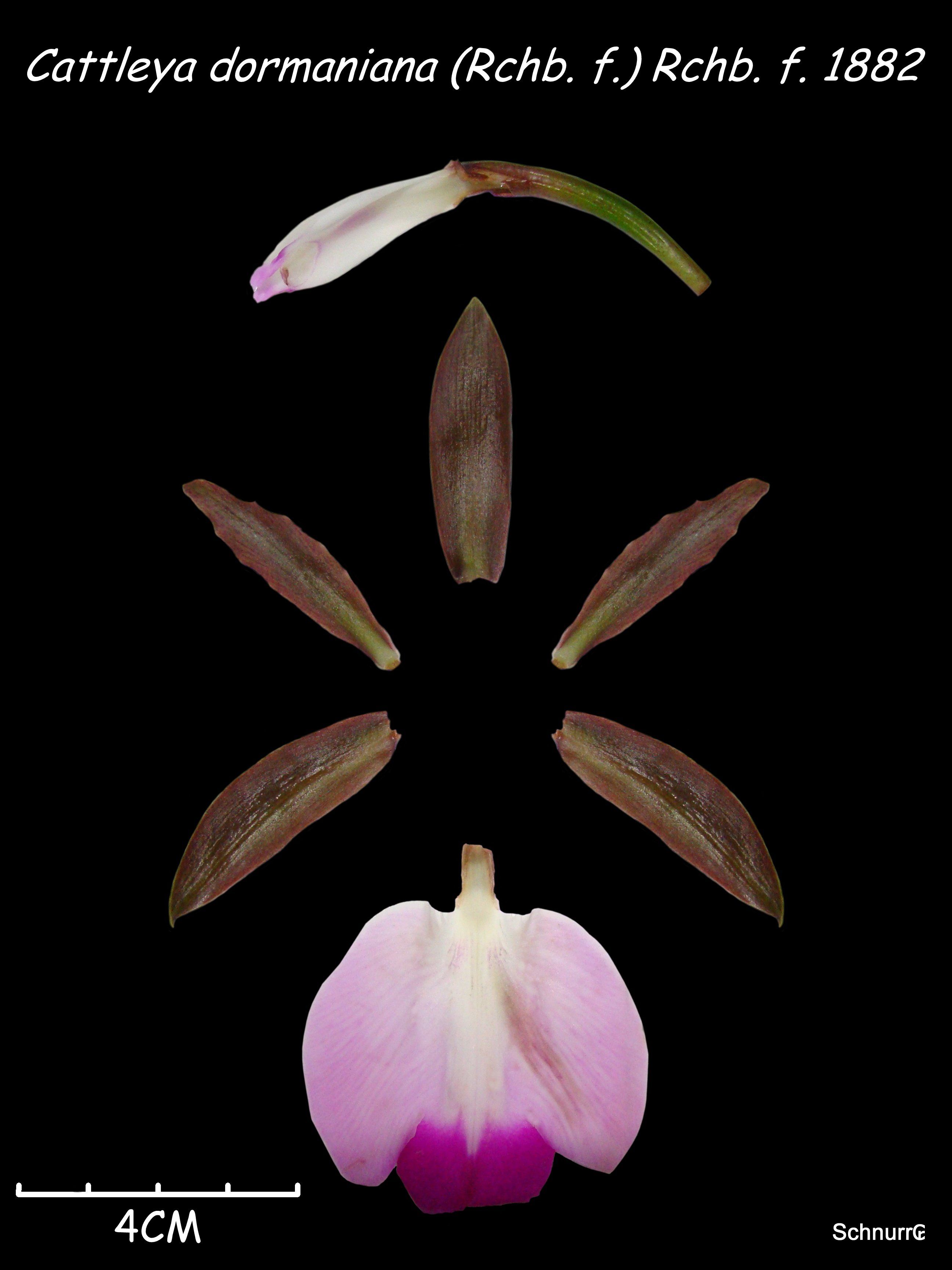 References AOS Bulletin Vol 77 No 11 2008 photo fide; AOS Bulletin Vol 26 No 6 1957 photo fide; AOS Bulletin Vol 29 No 6 1960 photo/drawing fide; AOS Bulletin Vol 35 No 10 1966; Orchidaceae Brasilienses Pabst & Dungs Band I 1975 drawing fide; Die Orchideen 3 Auflage Bd 1 Sonderabdruck aus Schlechter Lieferung 10 576 - 632 Brieger, Maatsch and Senghas 1977 drawing fide; The Brazilian Bifoliate Cattleyas and Their Color Variations Fowlie 1977; AOS Bulletin Vol 49 No 6 1980 photo fide; AOS Bulletin Vol 49 #7 1980 photo fide; The Catttleya and their Relatives Withner Vol 1 1988 photo fide; Schlechteriana Vol 2 No 2 1991 photo fide; Schlechteriana Vol 2 No 2 1991 photo as *C dormanniana var alba; The Manual of Cultivated Orchids Bechtel, Cribb and Laurent 1992 photo fide; Orchids of Brazil McQueen 1993 photo fide; Orchid Digest Vol 61 #3 1997 photo fide; Orchid Australia Vol 11 No 3 1999 photo; Botanica's Orchids Laurel Glen 2002; AOS Bulletin Vol 73 No 1 2004 photo; AOS Bulletin Vol 75 No 9 2006 photo fide; AOS Bulletin Vol 77 No 11 2008 photo fide; The Organ Mountain Range Its History and its Orchids Miller, Warren, Miller and Seehauer 2008 drawing/photo fide; AOS Bulletin Vol 86 # 7 2017 photo fide;
