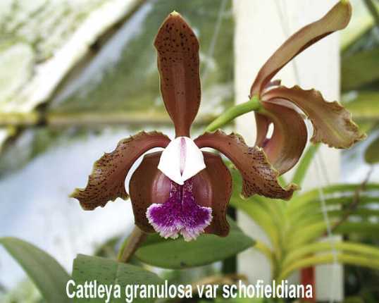 Synonyms Cattleya granulosa f. schofieldiana (Rchb.f.) A.D.Hawkes 1965 ; Cattleya granulosa var. banneri Rolfe 1896; *Cattleya granulosa Lindley var schofieldiana [Rchb.f] Veitch 1887; Cattleya princeps auct. 1892; Cattleya schofieldiana var. banneri (Rolfe) Fowlie 1977; Cattleya schofieldiana var. tedescoana L.C.Menezes 2009