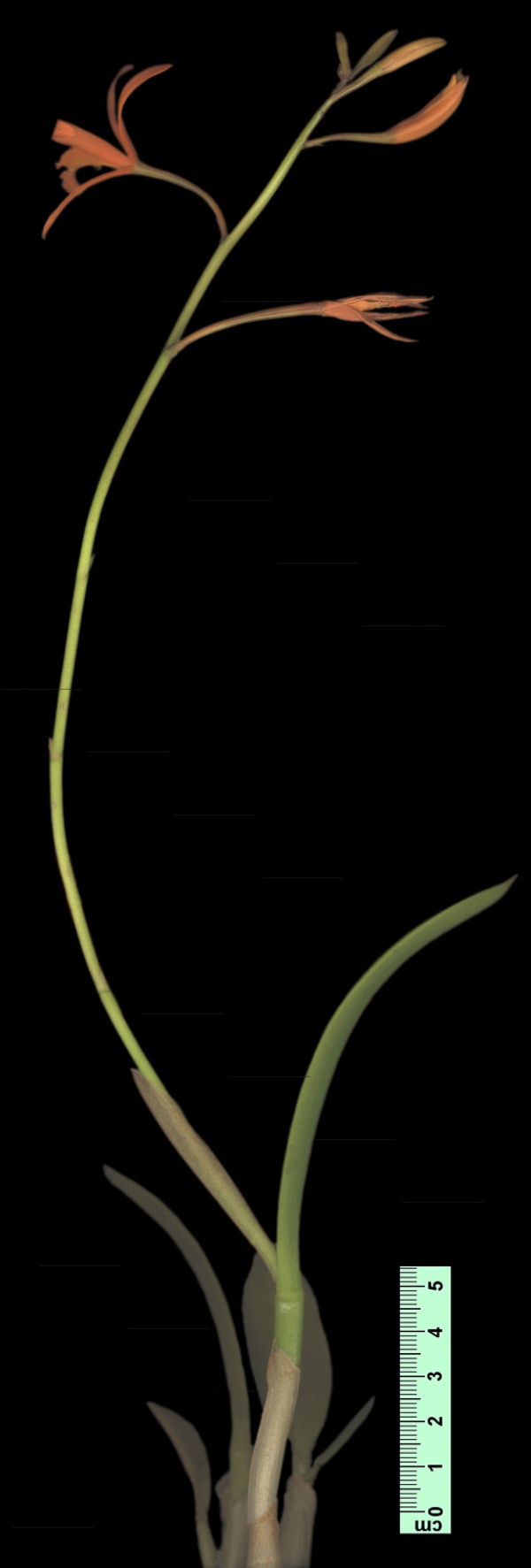 Found in Rio de Janiero state of Brazil at elevations around 1000 to 1200 meters as a small sized, cool growing lithophyte with obovate pseudobulbs carrying a single, apical, erect, oblong, apiculate, coriaceous, decurved leaf that blooms in the summer on an apical, to 14" [35 cm] long overall, rachis to 4.8" [12 cm] long, sequentially few to several flowered inflorescence arising through a linear-truncate, oblique spathe.