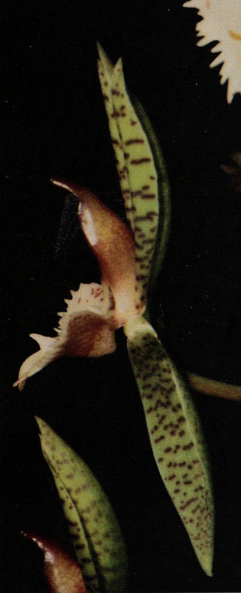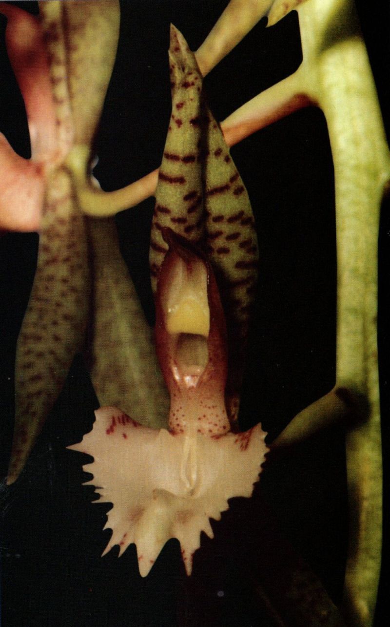 Found in Santander department of Colombia at elevations around 700 meters as a large sized, warm growing epiphyte with fusiform, elongate pseudobulbs carrying 6 to 8, plicate, elliptic-lanceolate, acuminate, petiolate base leaves that blooms in the later spring on a male, basal, arching, 24" [60 cm] long, to 23 flowered inflorescence .