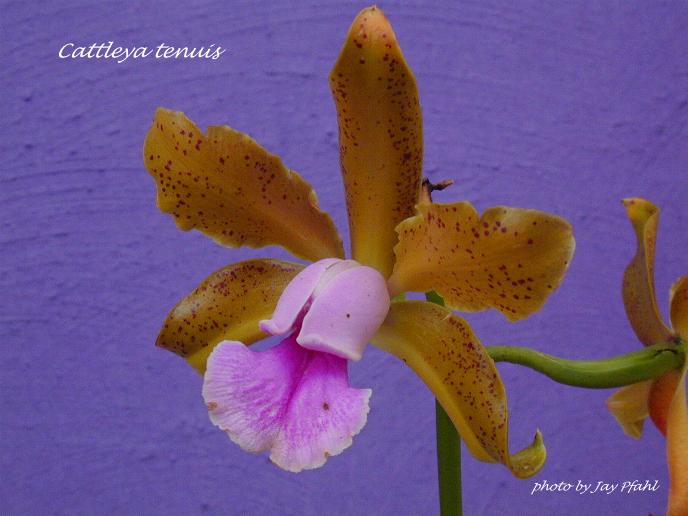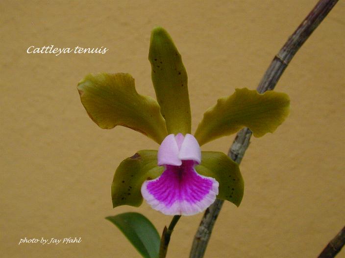 This is a medium sized, cool to warm growing epiphyte or lithophyte from inland Pernambuco and Bahia states of Brazil at elevations of 1000 to 1200 meters in dense, semi-arid thickets on small treetrunks or on rocks below with a long [to 3'], slender, cylindrical, elongate pseudobulb carrying 2 apical, thin, narrow, pointed, spreading, elliptic-oblong, very coriaceous leaves that needs a distinct dry winter rest which in turn will bring about blooming, mostly in the late summer and fall on a terminal, to 1 1/2' [45 cm] long, few to several flowered inflorescence subtended by a broad sheath and giving rise to heavy textured, waxy, fragrant flowers that can be long or short lived.