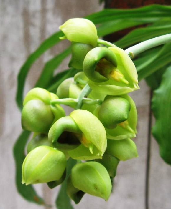 Found in Pernambuco, Alagoas and Ceara states of Brazil on palms near seashores, pastures and arid inland countrysides as a medium sized, hot growing epiphyte that requires a long dry season with fusiform to elliptical, angled, curved, conspicuously furrowed pseudobulbs enveloped completely by imbricate leafless to leaf bearing above sheaths and carrying up to 7, linear-lanceolate to oblanceolate, medium to dark green, plicate, 3 veined leaves that blooms in the summer and fall on a male, arching then pendant, 19.2 to 24" [48 to 60 cm] long, to 22 flowered inflorescence with the flowers held in the apical 1/3.