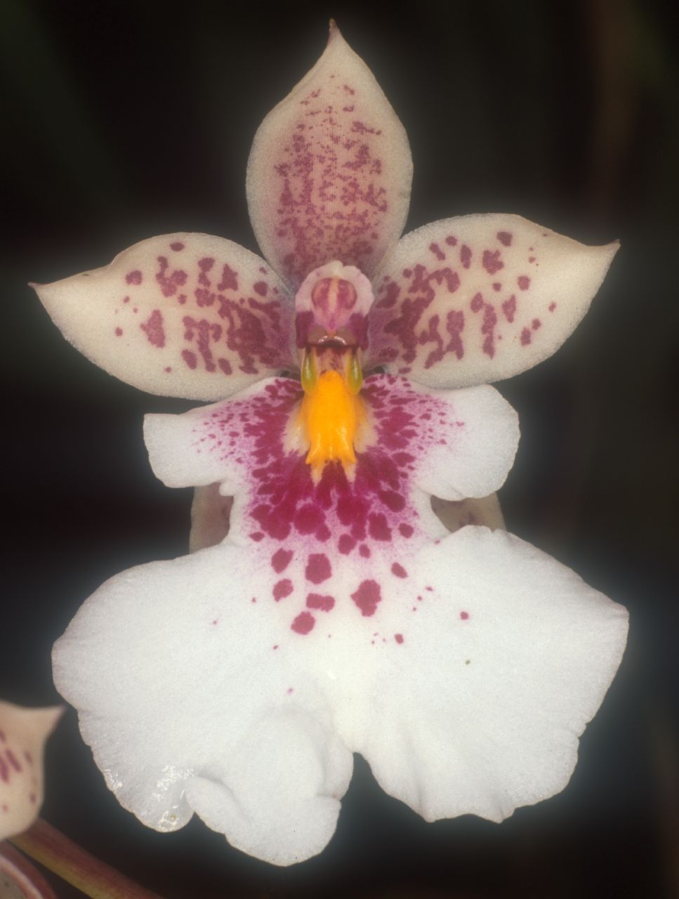 Found in Ecuador and Peru at elevations of 2300 to 3200 meters as a small sized, cold growing epiphyte with egg to pear-shaped, slightly laterally compressed pseuodbulbs enveloped basally by several imbricating, leaf-bearing sheaths and carrying 1 to 2 apical, linear to narrowly lanceolate, slightly leathery, dorsally folded longitudinally and keeled below, acute leaves that bloom in the fall and winter on an axillary, erect to suberect, to 12" [30 cm] long, racemose to loosely paniculate, fractiflex inflorescence arising from the leaf bearing sheaths and carrying 8 to 12 showy flowers.