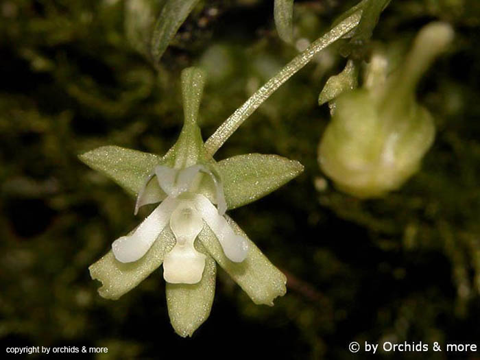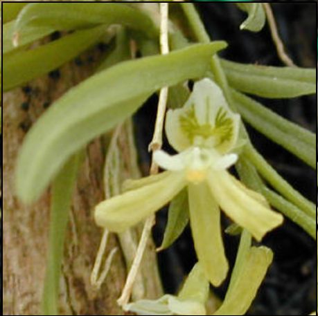 Found in Minas Gerais and Espirito Santo states of Brazil by streams at elevations around 700 to 800 meters as mini-miniature sized, warm growing epiphyte without pseudobulbs and a tight tuft of linear, dark green, keeled leaves that blooms in the later winter on a somewhat fleshy, erect, 2.8" [3 cm] long, to 8 flowered inflorescence.