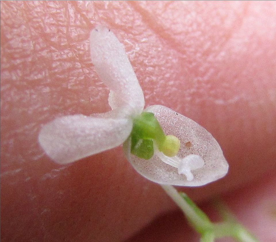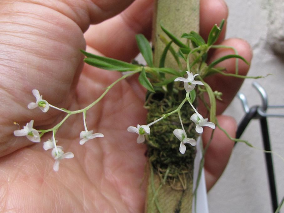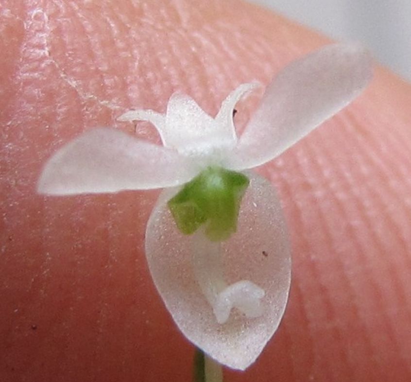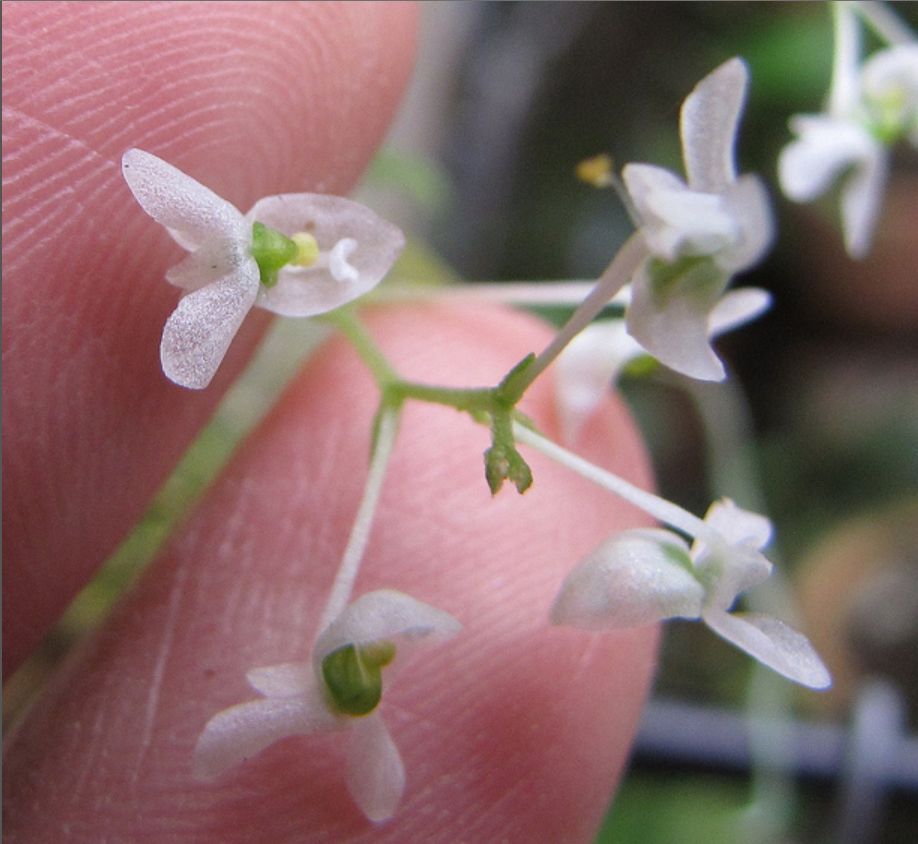 Found in Minas Gerais, Rio de Janiero, Sao Paulo and Parana' states of Brazil as a mini-miniature sized, warm to cool growing epiphyte with very clustered, fusiform-oblong, dark green, longitudinally ribbed with age pseudobulbs with a few basal sheaths and carrying a single, erect, dark green, coricaeous,linear, acute, gradually narrowing below into the base leaf that blooms in the summer on a basal, 2" [5 cm] long, 2 to 6 flowered inflorescence