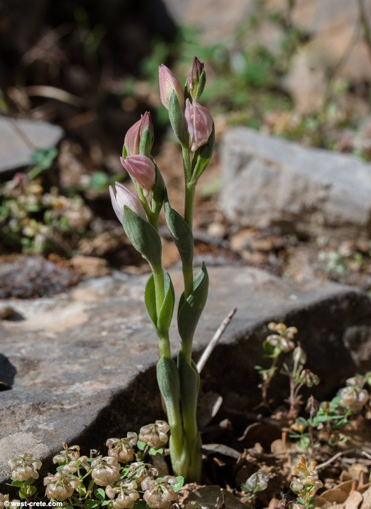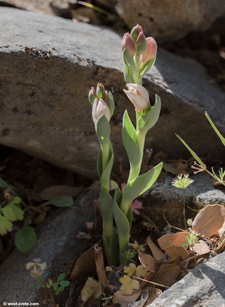 Found in Crete in mixed forests with oak, cypress and maple at elevations of 700 to 1500 meters as a miniature to small sized, cold growing terrestrial with a flexuous, hairless, grooved towards the tip stem carrying lowest almost on the soil, 2 to 4, oblong-lanceolate, hooded, pointed, erect, dark, glaucous, near clasping basally leaves grading to bracts above that blooms in the later spring on a terminal, erect, 1.6 to 6" [4 to 15 cm] long, lax, 4 to 30 flowered inflorescence.