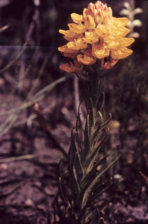 Found only in southwestern and southern South Africa at elevations of sea-level to 450 meters as a fairly robust, medium sized, cold growing terrestrial occuring along the Cape Province coast in seasonally wet, sandy habitats with linear leaves and blooms in the summer on an erect, terminal, to 6" [15 cm] long, densely many flowered infloresence