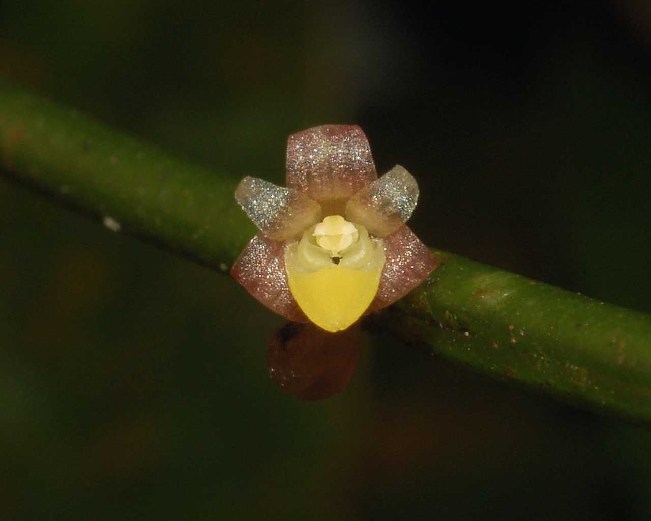 Found in Thailand, Malaysia, Borneo and Sumatra in low moss and scrub in lower and upper montane forests at elevations of 500 to 3200 meters as a small to medium sized, warm to cold growing epiphyte with very close set stems enveloped basally by 3 to 4 sheaths and carrying almost terete, shallowly grooved above leaves that blooms on a fascile of very short, single flowered inflorescence with the flower held against the mid leaf