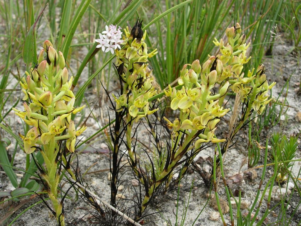 Found only in southwestern and southern South Africa in marshes or rock flushes at elevations of sea-level to 1050 meters as a slender, to medium sized, cold growing terrestrial with numerous, linear leaves that blooms in the spring on an erect, terminal, to 6" [15 cm] long, lax to fairly dense, numerous flowered inflorescence carrying unpleasantly scented flowers