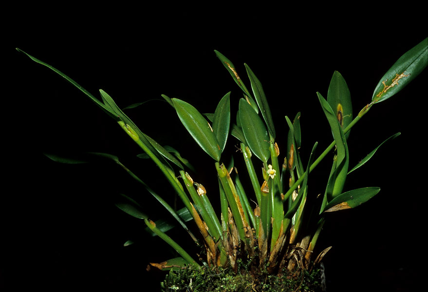 Found in central and western Java on small trees at elevations of 1500 to 2500 meters as a small sized, cool to cold growing epiphyte with close set, flattened stems with acute edges carrying lanceolate, bilobed apically, long petiolate base leaves that blooms in the winter on a short, 1 to 2 flowered inflorescence