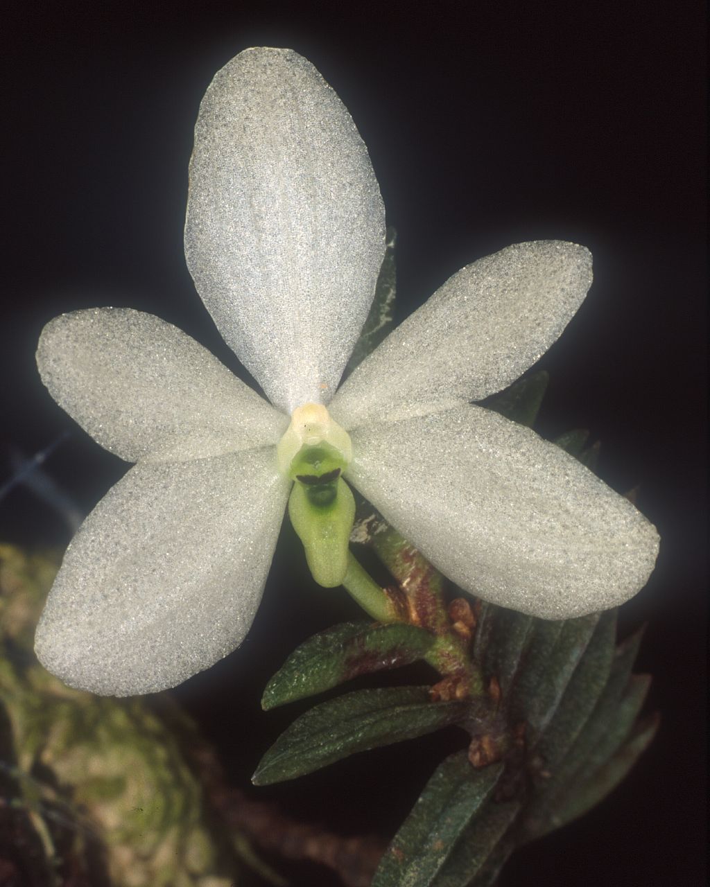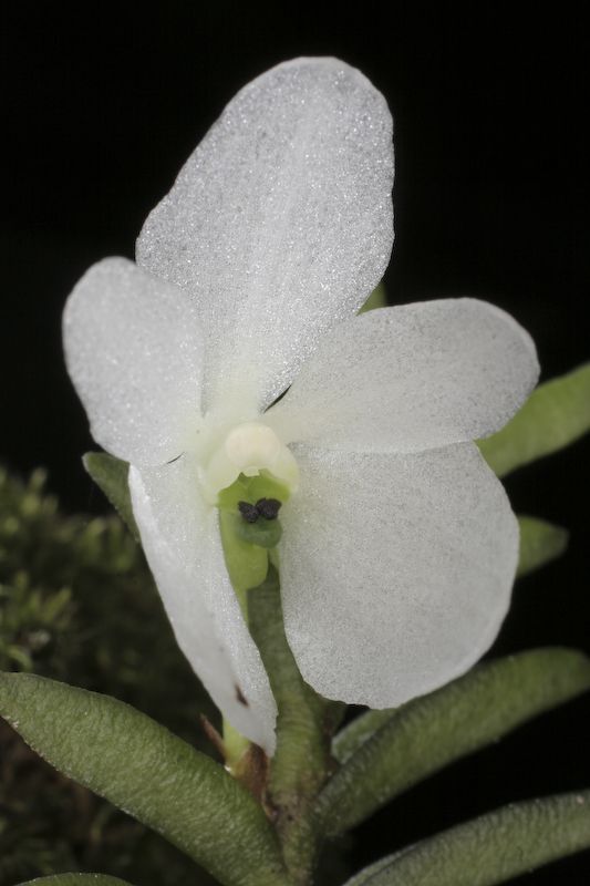 Found in Java in higher montane forests on mossy and lichen covered trees at elevations of 1000 to 2000 meters as a mini-miniature sized, cool growing, monopodial epiphyte monopodial orchid has a short, tiny, densely leafy stem with two ranked, thick, fleshy, terete and deeply channeled above, acute, mostly green but can be red speckled [usually denotes that it is exposed to full sun] leaves that blooms at any time of the year on several axillary, short single flowered inflorescence with up to three arising from near the apex of the stem carrying flowers larger than the entire plant.