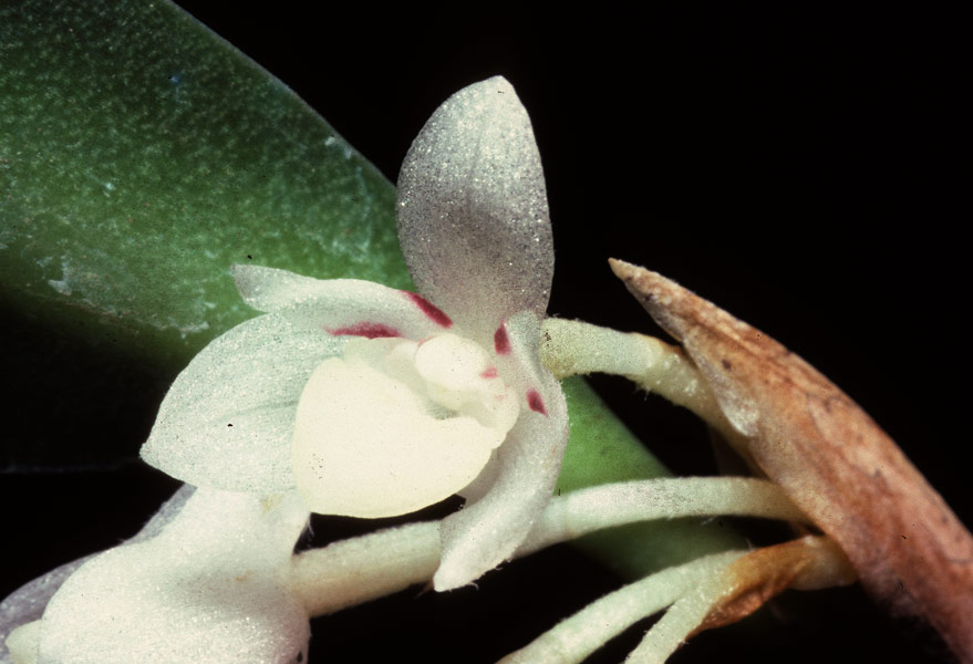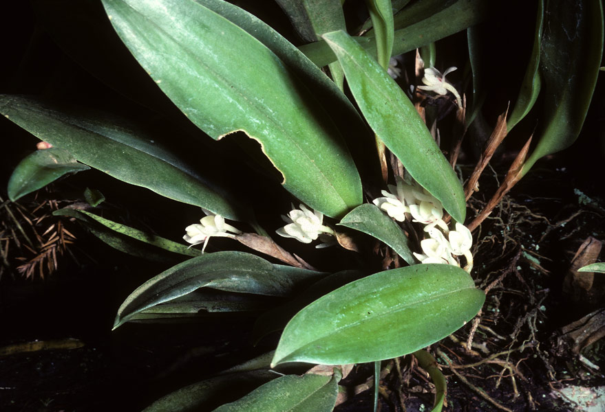 Found in eastern Java in montane forests at elevations around 1400 to 1500 meters as a miniature sized, cool growing epiphyte with close set, 4 to 6 noded stems enveloped by imbricate brown sheaths and carrying a single, elliptic-oblong, stiff, fleshy, acute, gradually narrowing below into the shortly petiolate base leaf that blooms in the late spring on 1 to 5 per stem, arising through a common brown sheath, each held on .6" [1.5 cm] long, white pedicels.