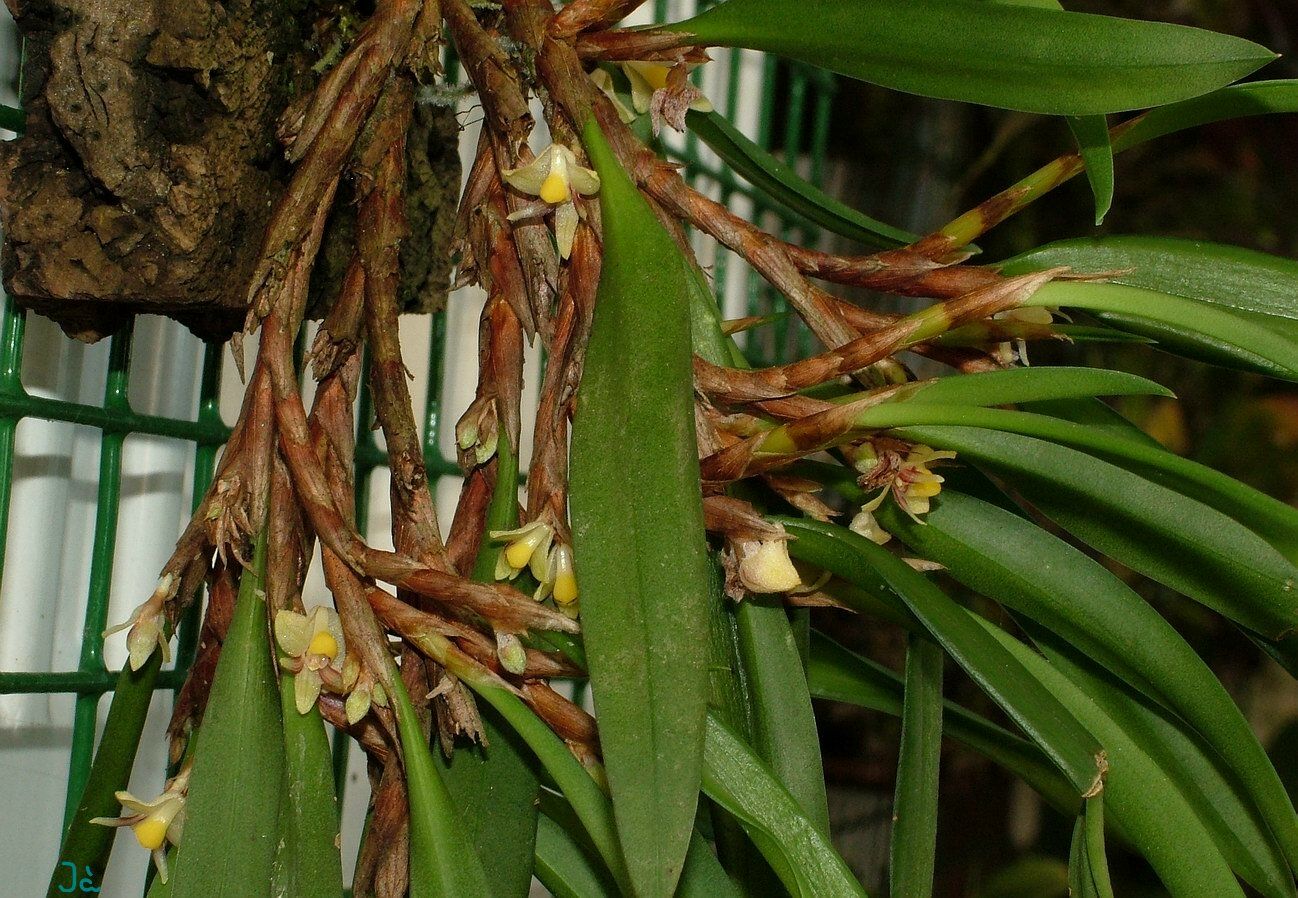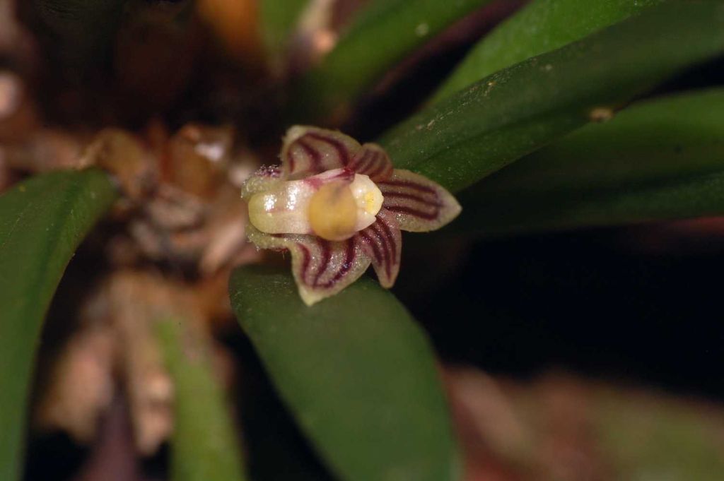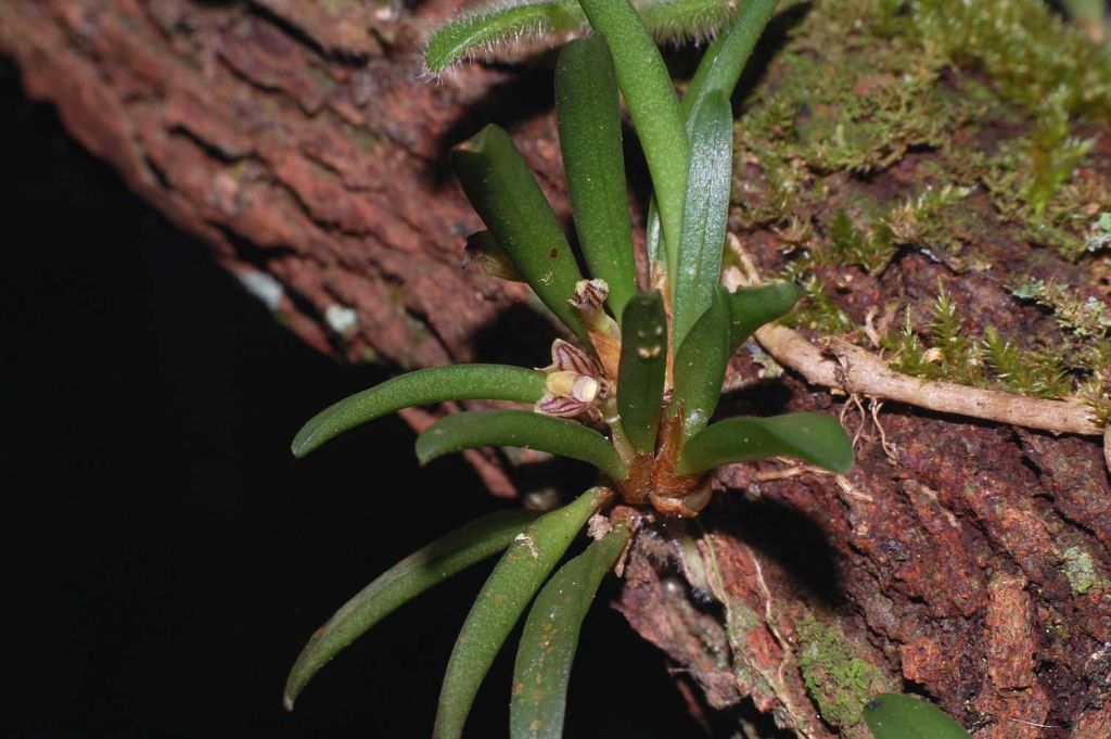 Found in Assam, the eastern Himalayas, Nepal, Laos, Myanmar, Malaysia, Vietnam and Yunnan province of China in sparse woods on trees or rocks at elevations of 225 to 1900 meters as a miniature to small sized, hot to cool growing epiphyte with a pendant, branched stem enveloped by imbricate, scarious sheaths and giving rise to a single, fleshy, linear-oblong, obliquely notched apically, acute, shortly petiolate leaf that blooms in the late spring on a subcapitate, 1 to 3 flowered inflorescence.