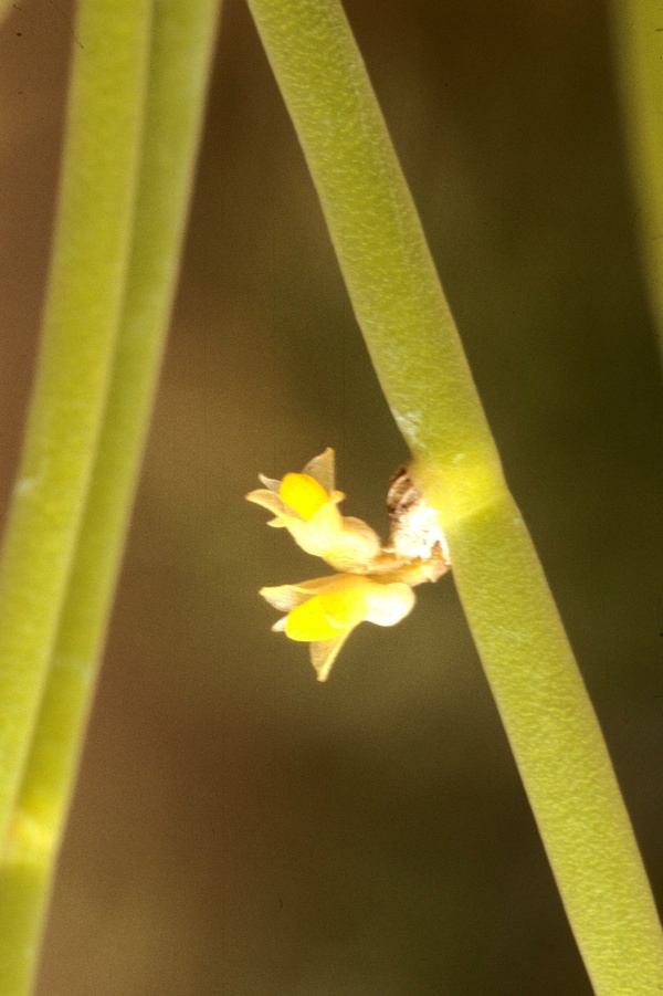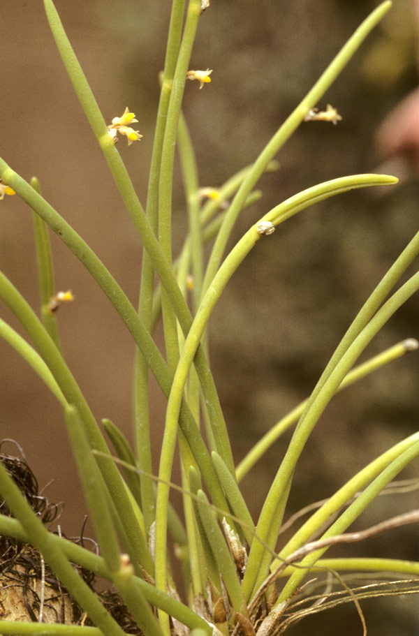 Found in New Caledonia at elevations of 700 to 1200 meters as a miniature sized, warm to cool growing epiphyte with clustered, terete, elongate stems carrying a single, terete, obtuse, channeled leaf that blooms in the fall on 1 to 2, sessile, single flowered inflorescnece