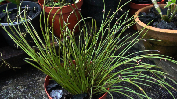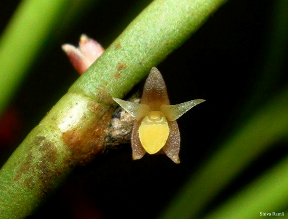 Found in western Sumatra at elevations around 1100 meters as a small to just medium sized, cool growing epiphyte with erect, tufted, terete, green, fleshy stems carrying a single, apical, erect, subulate, acute, fleshy leaf that blooms on .12" [3 mm] long, in a head-like fascile of many successively single inflorescence carrying sordid purple flowers with a yellow lip.