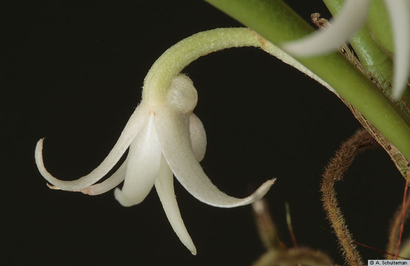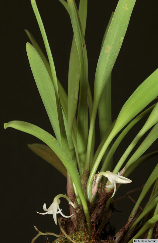 Found in Thailand, Vietnam, penninsular Malaysia, Borneo, Java, and Sumatra in lower montane forests in deep shade on tree trunks at elevations of 450 to 2000 meters as a miniature to small sized, warm to cool growing epiphyte with terete stems enveloped by basal sheaths and carrying a single, apical, erect, linear, acute, shortly petiolate leaf that blooms in the spring on a basal, very short, single flowered, shortly pubescent inflorescence carrying a wide open star-shaped flowers.