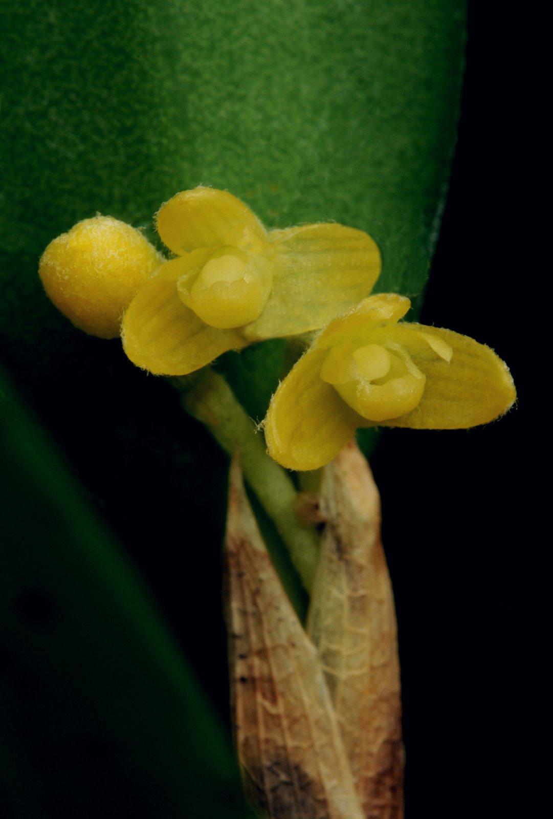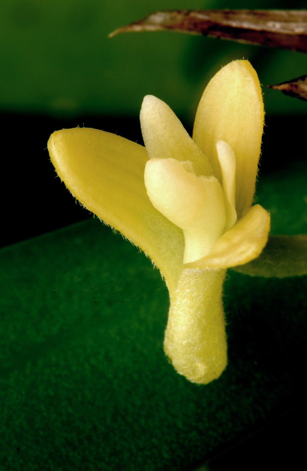 Found in New Guinea at elevations around 450 meters as a small sized, hot growing epiphyte with terete, glabrous pseudobulbs carrying a single apical, erect, lanceolate, acuminate leaf that blooms in the fall on a short, few flowered inflorescence.