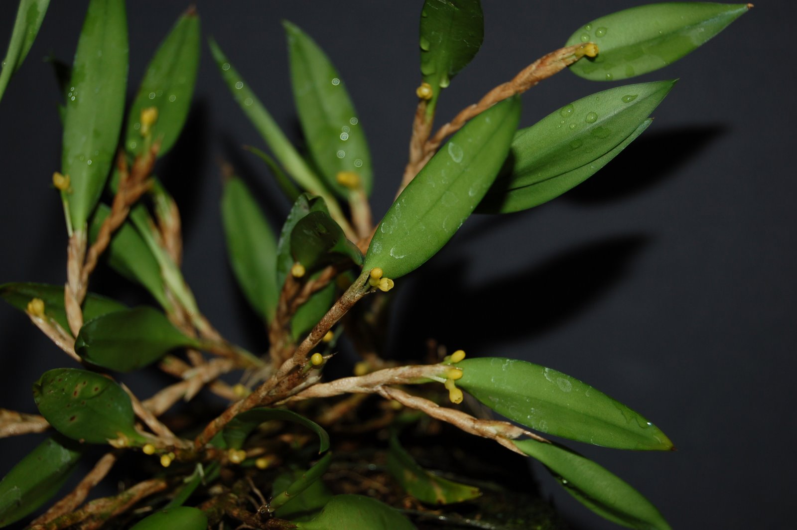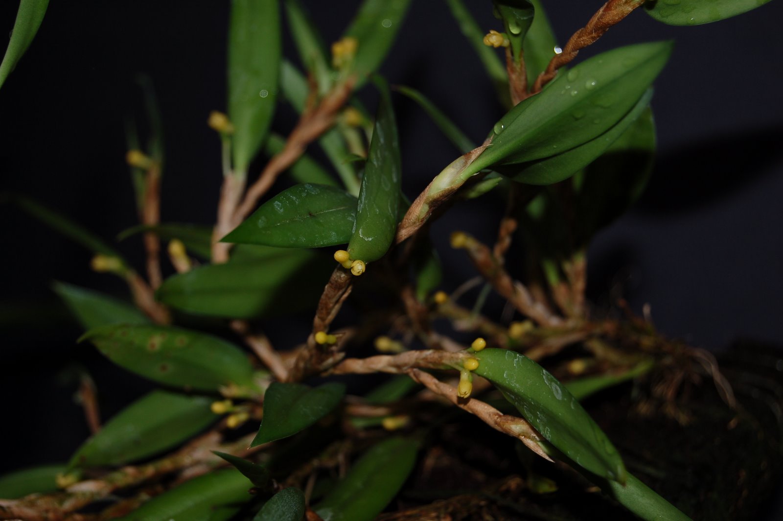 Found in Sumatra and Java at elevations of 800 to 2600 meters as a miniature sized but large mat growing, warm to cold growing trunk epiphyte with a creeping, branching rhizome with .8 to 2" between each short stem carrying single, apical, very narrowly lanceolate, acute leaves that blooms in the late winter and spring on a to a few short, single flowered inflorescence with ovate-triangular, acute floral bracts