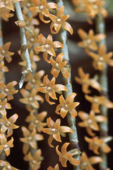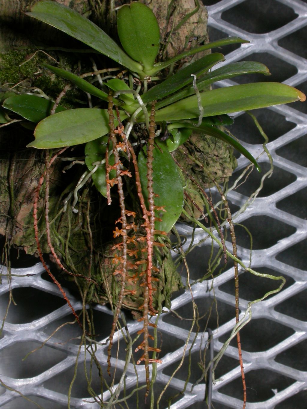Found in the Comoros Islands at elevations of sealevel to 750 meters as a miniature to small sized, hot to warm growing, monopodial epiphyte with a short stem carrying 4 to 7 obovate-oblong , unequally obtuse and bilobed apically leaves that blooms in the spring with numerous pendant, 8" [20 cm] long racemes of many densly packed, alternate, miniature flowers.