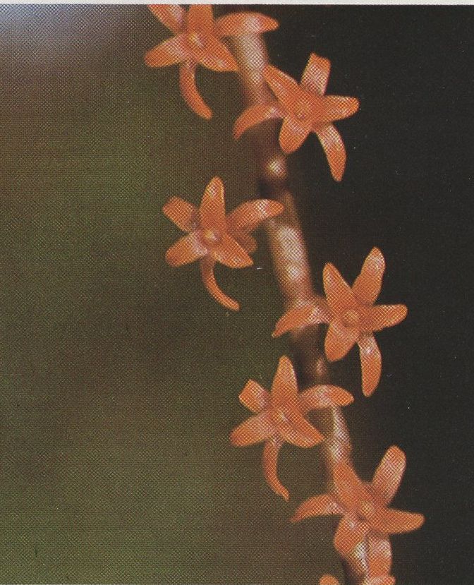 Found in the Comoros Islands as a small sized epiphyte with a short stem carrying a few, oblong, unequally bilobed apically leaves that blooms on 6" + [15 cm] long, shortly pedunculate, many flowered inflorescence with very small bracts and carrying very small flowers.