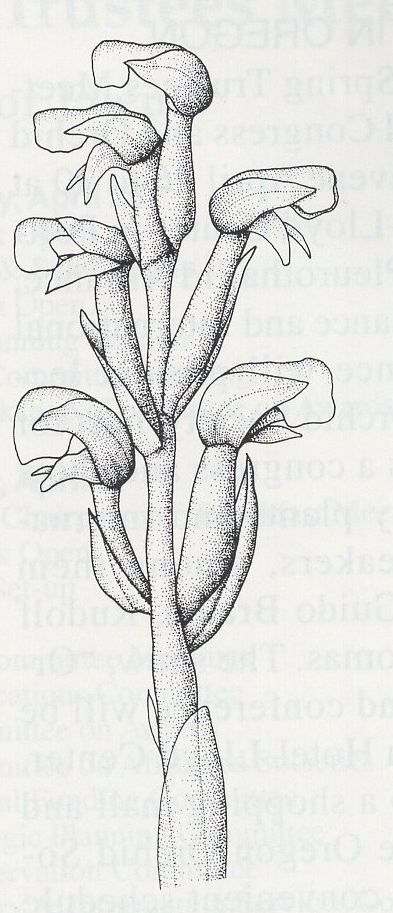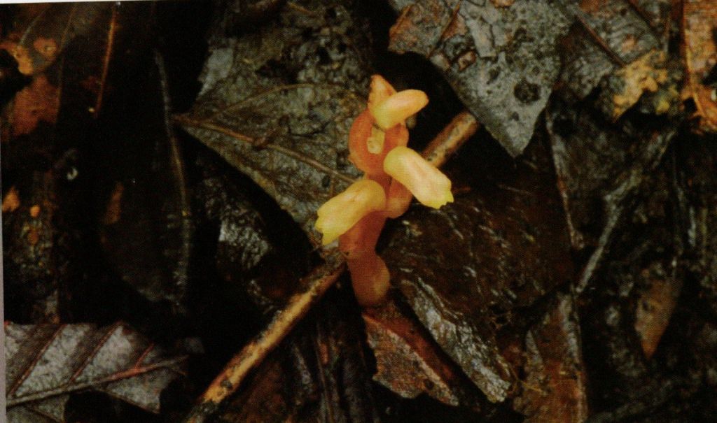 Found in western Sichuan and Yunnan provinces of China in montane evergreen forests on slopes at elevations of 1200 to 2600 meters as a mini-miniature to miniature sized, cool to cold growing mycoheterotropic terrestrial with a stout, fleshy rhizome giving rise to an erect, pale brownish yellow stem carrying a few brownish yellow scales that blooms in the summer on an erect, peduncle 1 to 3.8" [2.5 to 9.5 cm] long, unbranched, rachis 1 to 2.2" [2.5 to 5.5 cm] long, few to more than to 10 flowered inflorescence with ovate-lanceolate, galbrous, acuteslightly shorter than the ovary floral bracts and carrying non-resupinate flowers at the apex.