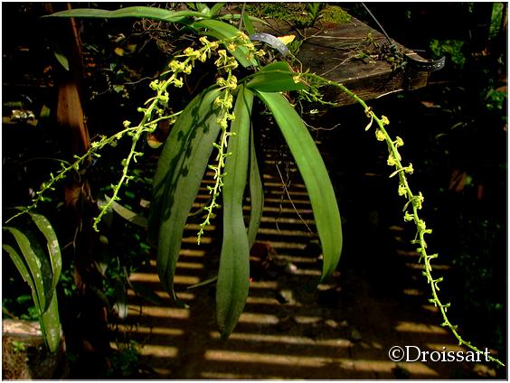 Found in Sierra Leone, Ivory Coast, Liberia, Nigeria, Cameroon, Congo and Gabon in evergreen rain forests in deep shade as a small sized, warm growing epiphyte with a short stem enveloped completely by imbricating leaf-bearing sheaths and carrying 2 ranked, basally twisted so as to all face the same direction, lanceolate, leathery, unequally bilobed apically leaves that blooms in the summer and fall on an axillary, or at the base of the stem, slender, to 14" [35 cm] long, many flowered inflorescence with one color changing flower per node