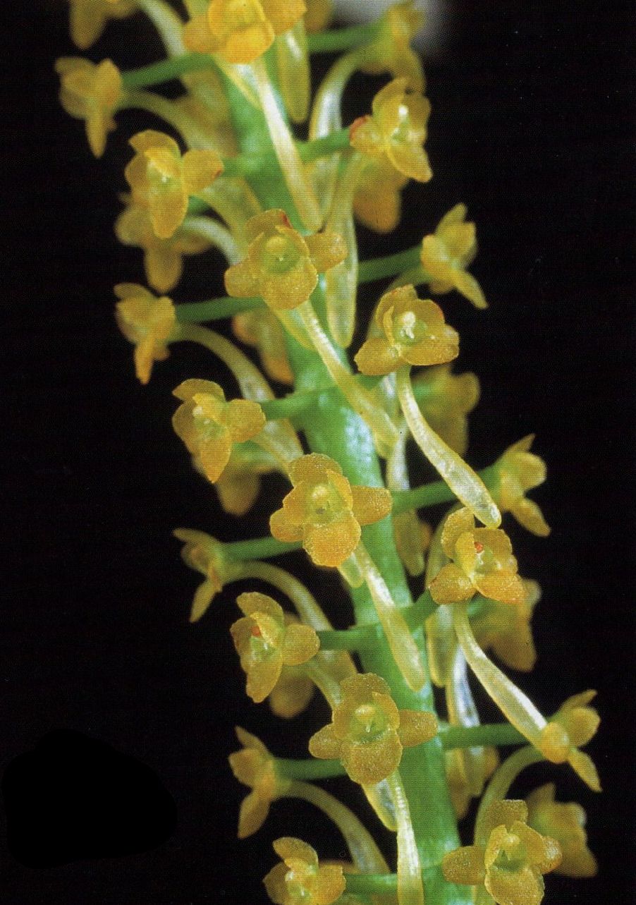 Found in Sierra Leone, Liberia, Ivory Coast, Nigeria, Burundi, Cameroon, Congo, Equatorial Guinea, Central African Republic, Gabon, Zaire, Rwanda, Angola, Kenya, Malawi, Tanzania and Uganda as a small to medium sized, warm to cool growing, monopodial epiphyte and occasional terrestrial [likely from fallen plants off trees] that likes shade on tree trunks and branches in tropical rainforests near riverways at elevations of 900 to 2100 meters with a woody, pendant stem with distichous, narrowly oblanceolate, very unequal and acutely bilobed apically with the shorter lobe often almost nonexistent, fleshy, olive green leaves from which arises in the late summer and fall on several, pendant, 10" [25 cm] long, densely many [50] flowered inflorescence with 2, 4 or 6, fragrant, green flowers that yellow with age arranged in many whorls up and down the inflorescence.