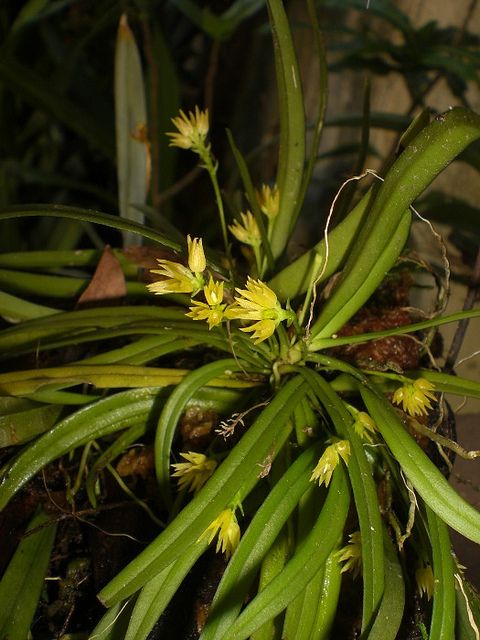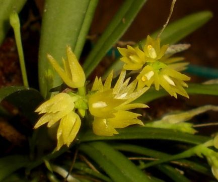 Found in southern Taiwan and the Philippines in forests on tree trunks as a miniature sized epiphyte with a short stem carrying 8 to 10, distichous, leathery, linear, falcate, acute and irregularily bilobed apically, amplexicaul sheathing base leaves that blooms in the winter on an axillary, simple, pendulous, .8 to 1.2" [2 to 3 cm] long, many flowered inflorescence with linear-lanceolate, acuminate floral bracts