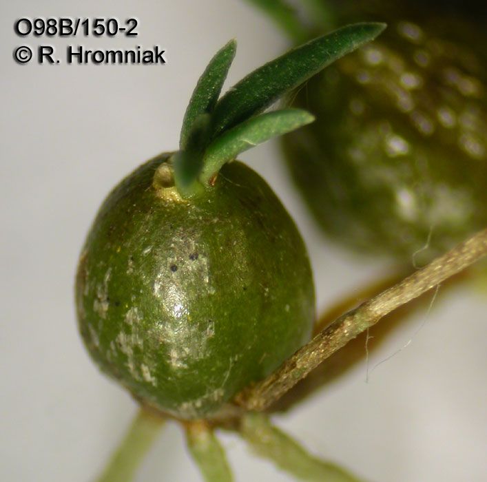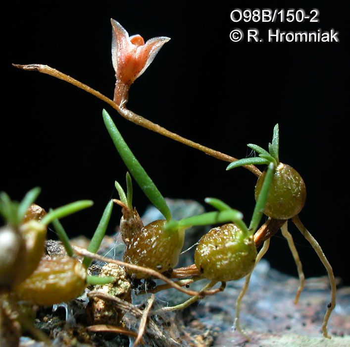 Found in Kenya, Zimbabwe and Eastern Zambia in upland forests at elevations around 2000 meters on branches as a miniature sized, cool growing epiphyte related to Bulbophyllum with a long slender rhizome with 3/4 to 1" [2 to 2.5 cm] between each yellowish-green, oblong-ovoid pseudobulb carrying 6 to 11, apical, in a whorl, linear, stiff, needle-like leaves and blooms in the spring on a basal, 1 to 2 flowered, inflorescence carrying small reddish flowers