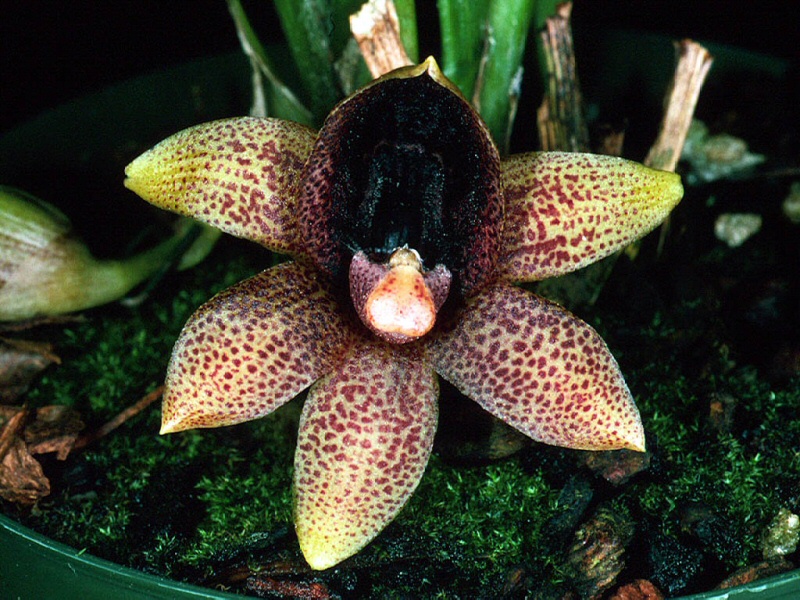 Found in Colombia on steep banks and cliffs in humus at elevations of 300 to 1500 meters as a miniature sized, hot to cool growing epiphyte or terrestrial that has a fan of a few leaves and blooms on a short, axillary, lateral at ground level, single flowered inflorescence carrying a fragrant flower with a foul fragrance.
