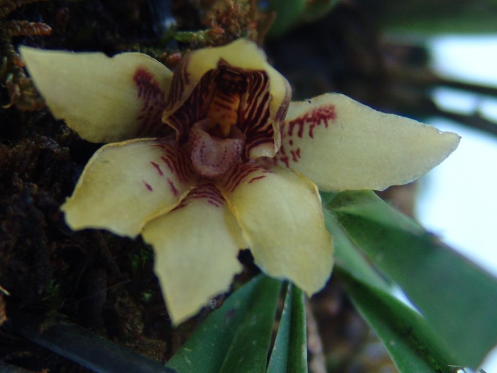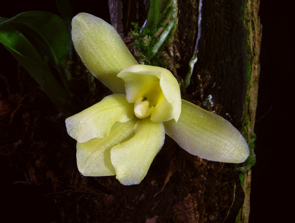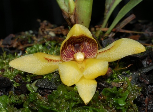 Found in Costa Rica, Panama, Colombia and Ecuador at elevations around 400 to 900 meters as a small sized, hot to warm growing epiphyte with a few subpetiolate, dark green leaves held in a fan shape that blooms in the spring on a short, pendant to lateral, single flowered inflorescence and carrying a non-resupinate flower.