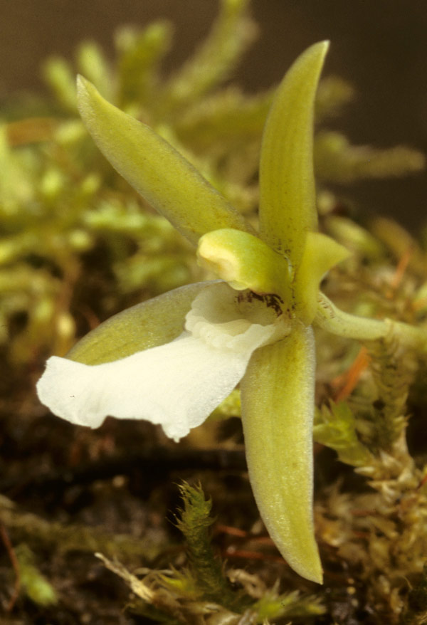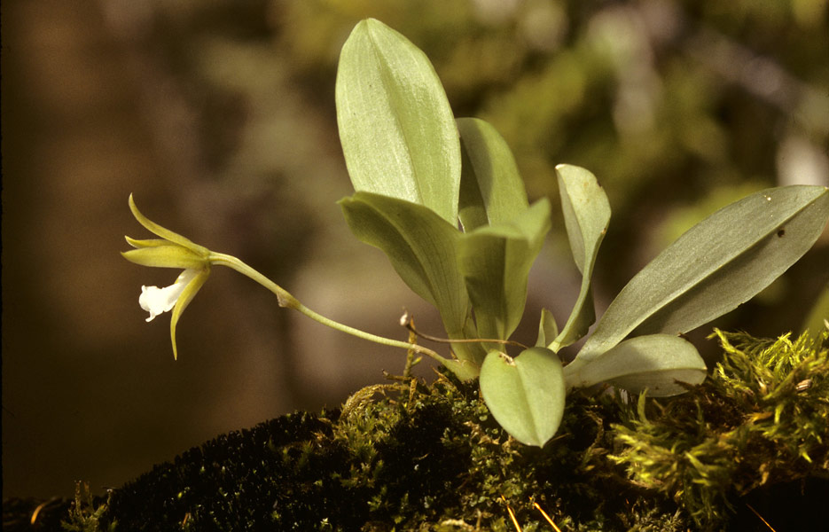 A miniature sized, warm growing epiphyte from Sao Paulo and Rio de Janiero states of Brazil at elevations of 700 to 800 meters with small, compressed pseudobulbs that become sulcate with age and are enveloped basally by 2 to 3 foliaceous sheaths on both sides and carrying a single, apical, lanceolate, acuminate leaf that is basally attenuate and canoe-shaped and blooms in the summer on an axillary, from the foliaceous sheaths, erect to horizontal, 2" [5 cm] long, single flowered inflorescence.