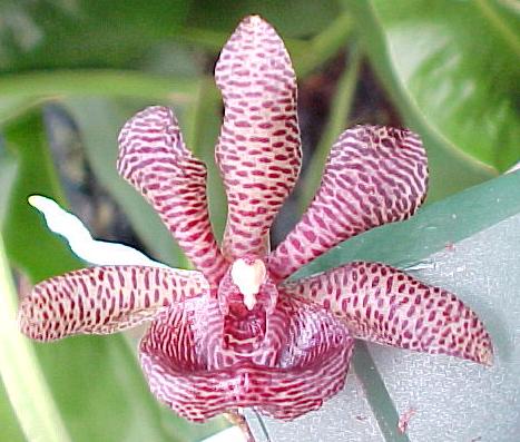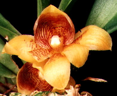 Found in Venezuela, Colombia, Ecuador and Peru in rather moist forests at elevations around 400 to 700 meters as a small sized, hot to warm growing epiphyte without pseudobulbs and having a loose fan-shape of narrowly elliptic, conduplicate towards the base leaves that blooms in the summer and early fall on a basal, 2" [5 cm] long, single flowered inflorescence carrying a non-resupinate flower.