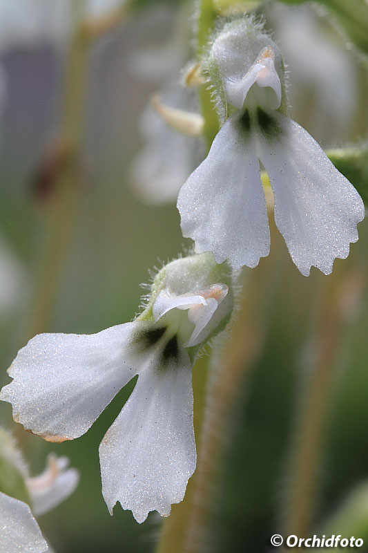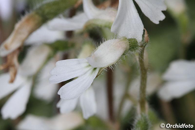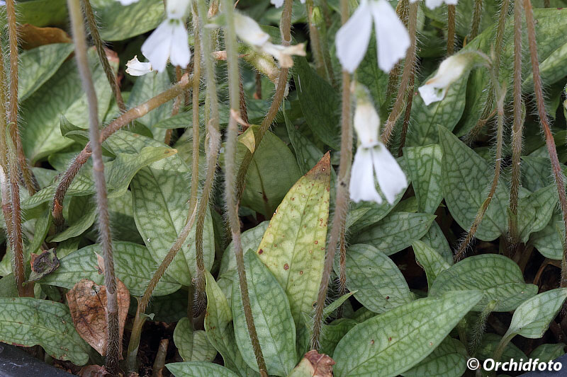 Found in Thailand in seasonal evergreen forests and tropical rainforests within usually limestone rock crevasses at elevations of 50 to 800 meters as a miniature to small sized, hot to warm growing terrestrial with a tuber giving rise to a short stem carrying 3 to 5, in a basal rosette, large for the genus, light olive brown with dark brown reticulation above and light brown to dull olive green below, lanceolate, gradually narrowing below into the petiolate base leaves that blooms in the fall and again in the late winter and earlier spring on an erect, very thin, glandular-pubescent, 5 to 12" [12.5 to 30 cm] long peduncle, rachis to 3" [7.5 cm] long, 1 to 7 flowered inflorescence with an acuminate, shorter than the ovary floral bract.