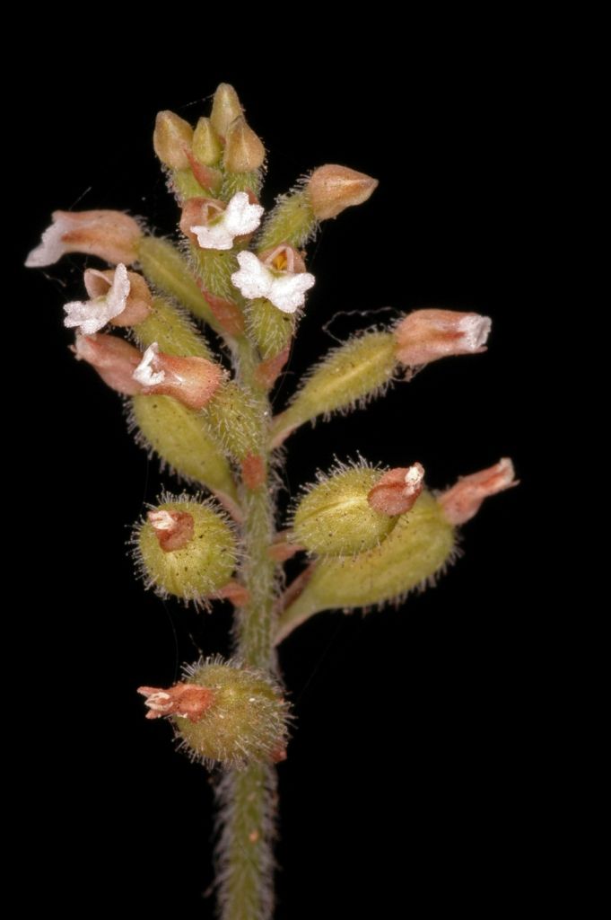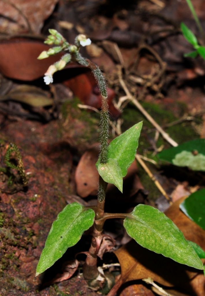 Found in western India and Sri Lanka in submontane and tropical wet evergreen forests at elevations of 600 to 1250 as a mini-miniature sized, warm to cool growing terrestrial with an erect pubescent stem carrying 3 to 6 or so, lanceolate-cordate, dark greenish brown above, glabrous, acute to acuminate, abruptly narrowing below into the petiolate base leaves that blooms in the winter on a terminal, erect, puberulous, 8 to 10 flowered inflorescence with as long as the pedicel floral bracts.