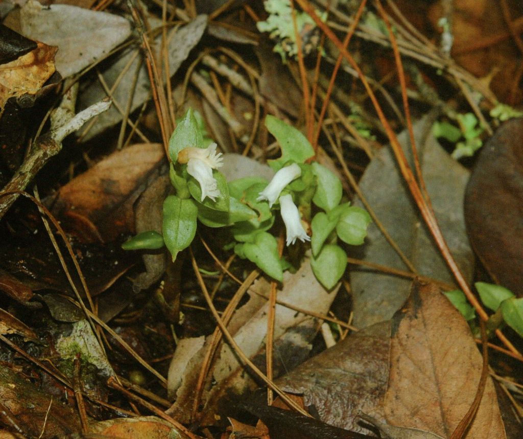 Found in southern Yunnan province of China in dense forest in deep shade at elevations around 2100 meters as a mini-miniature sized, cold growing terrestrial with an erect, terete, fleshy stem carrying 4 to 8, green, cauline, ovate, acute, rounded below into the petiolate like base leaves that blooms in the late summer and earlier fall on a terminal, erect, extremely short to .4" [1 cm] long, 2 to 3 flowered inflorescence enveloped by leaf bases and has green, ovate, shorter than the ovary, acuminate floral bracts.