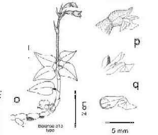 Found in north Vietnam as a very rare mini-miniature sized terrestrial that has an erect stem carrying 3 to 5 basal, triangular-cordate, acute, abruptly narrowing below into the short petiolate base leaves that blooms on an erect, 1.6" [4 cm] long, 2 to 4 flowered inflorescence with triangular-ovate, acuminate, pubescent, shorter than the ovary floral bracts.