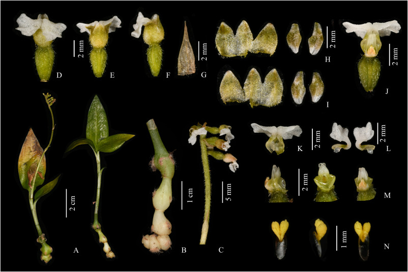Cheirostylis yei J.D. Ya, Z.D. Han & H. Jang 2021 - A. Plant; B. Rhizome; C. Inflorescence; D. Flower (front view); E. Flower (dorsal view); F. Flower (lateral view); G. Bract; H. Adaxial sepals and petals; I. Abaxial sepals and petals; J. Column and labellum; K. Labellum; L. Labellum (rip cutting); M. Column; N. Pollinarium.