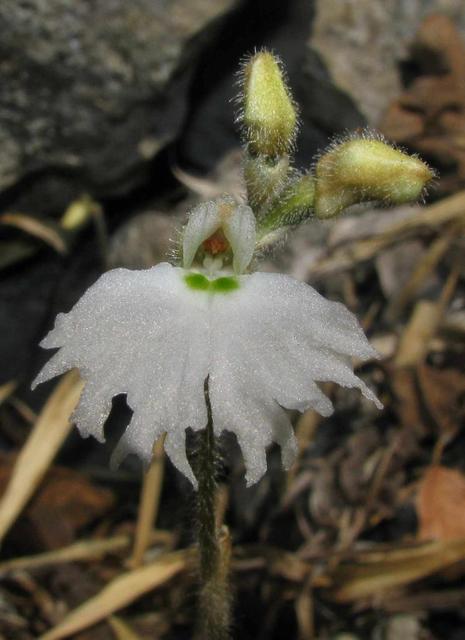 Found in the eastern Himalayas, Guangdong, Guangxi, southern Guizhou, hainan, southern Hunan, western Sichuan, and southern Yunnan provinces of China, Vietnam, Myanmar and Thailand in leaf litter on forest floor at elevations of 600 to 900 meters as a mini-miniature to miniature sized, warm growing terrestrial with a prostrate, moniliform, pale green pseudobulb carrying 2 to 5, ovate to shortly acuminate, 5 veined, petiolate base leaves that blooms in the spring on an erect, peduncle 3.04 to 5.6" [7.6 to 14 cm] long, terete, provided with 2 to 3, subtubular, acuminate, puberulous bracts, puberulous, 3.88 to 5.28" [8 to 16 cm] long, 2 to 4 flowered inflorescence with ovate-lanceolate, acuminate, puberulous, shorter than the ovary floral bracts.
