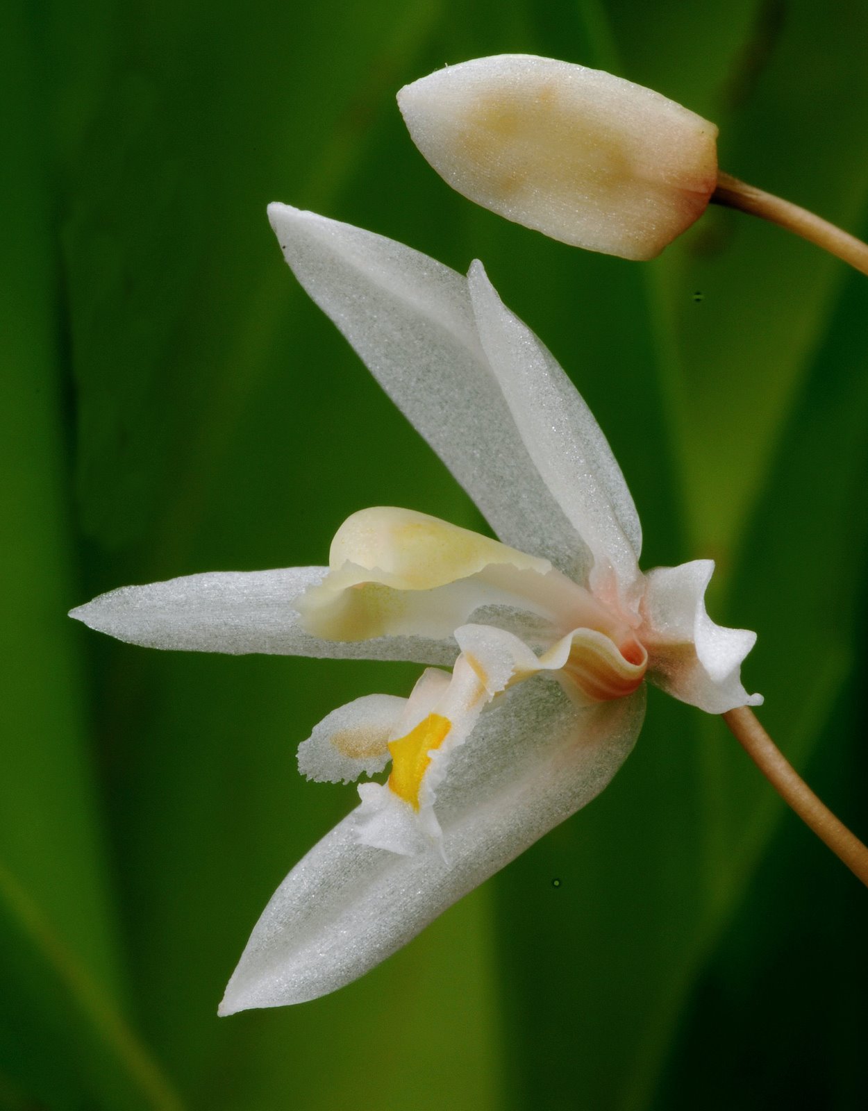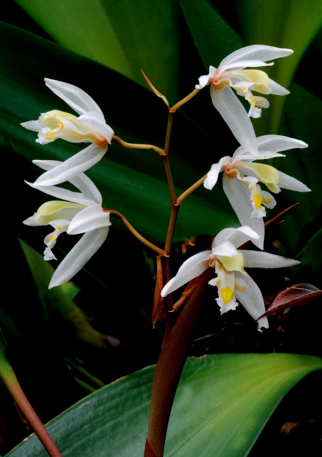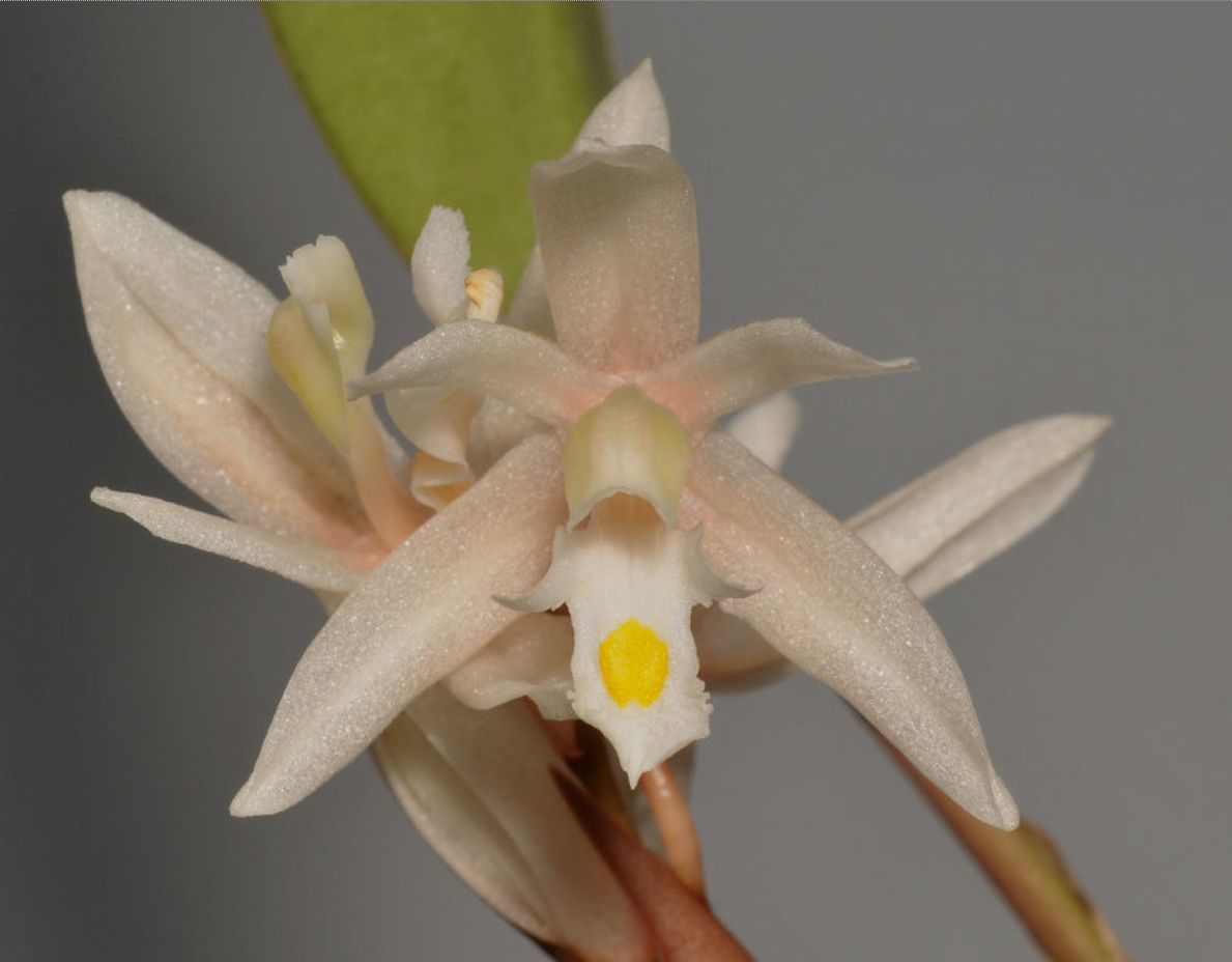 Found in Sarawak Borneo in montane and elfin forests on trunks and main branches often in mosses at elevations of 1500 to 2000 meters as a small to medium sized, cool growing epiphyte that differs from the type mainly in the color [white] and in the much larger flower and blooms in the later spring on a proteranthous to synanthous, slightly zigzag, to 10.8" [to 27 cm] long, 4 to 12 flowered inflorescence with ovate to ovate-oblong, glabrous to slightly minutely hairy floral bracts.