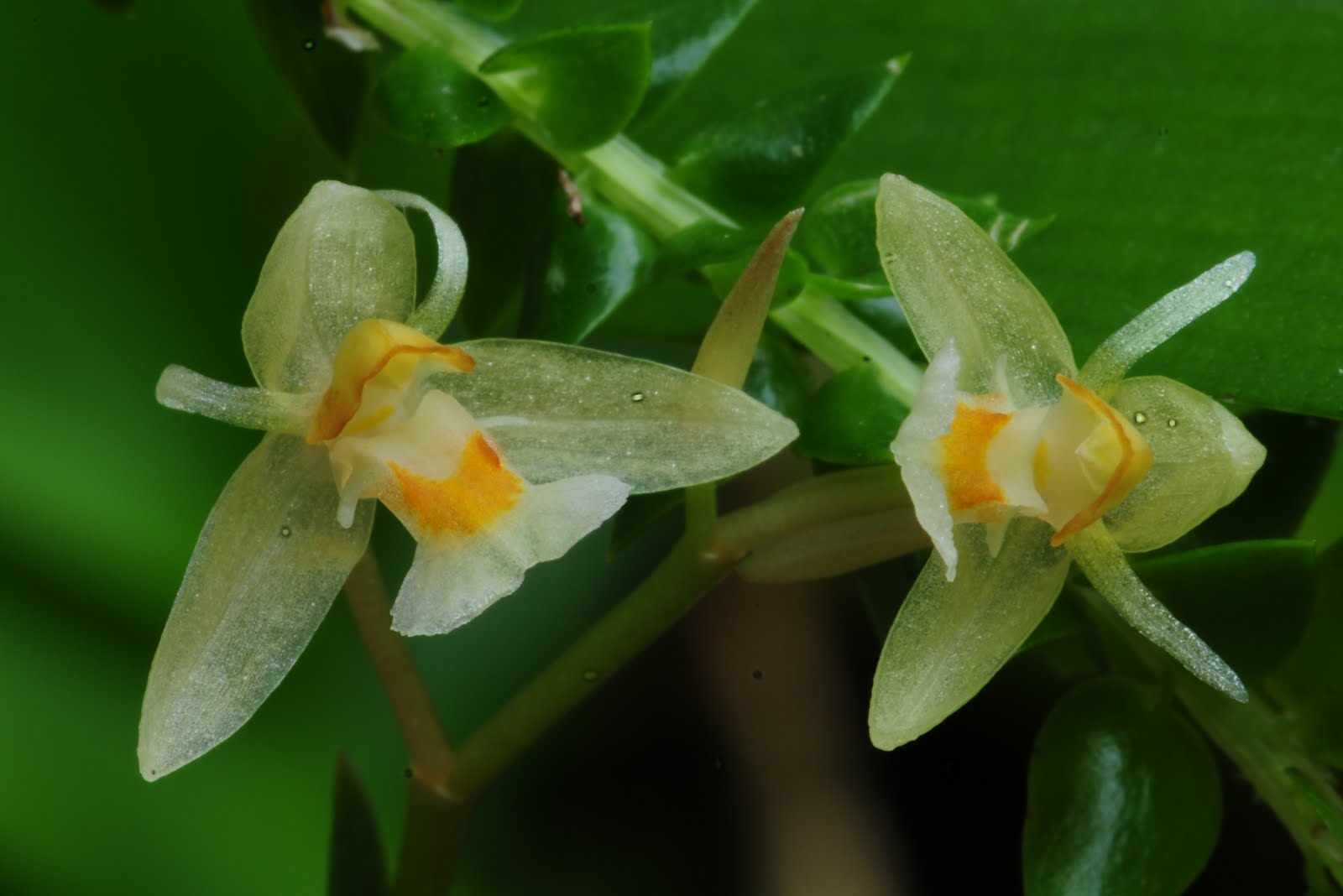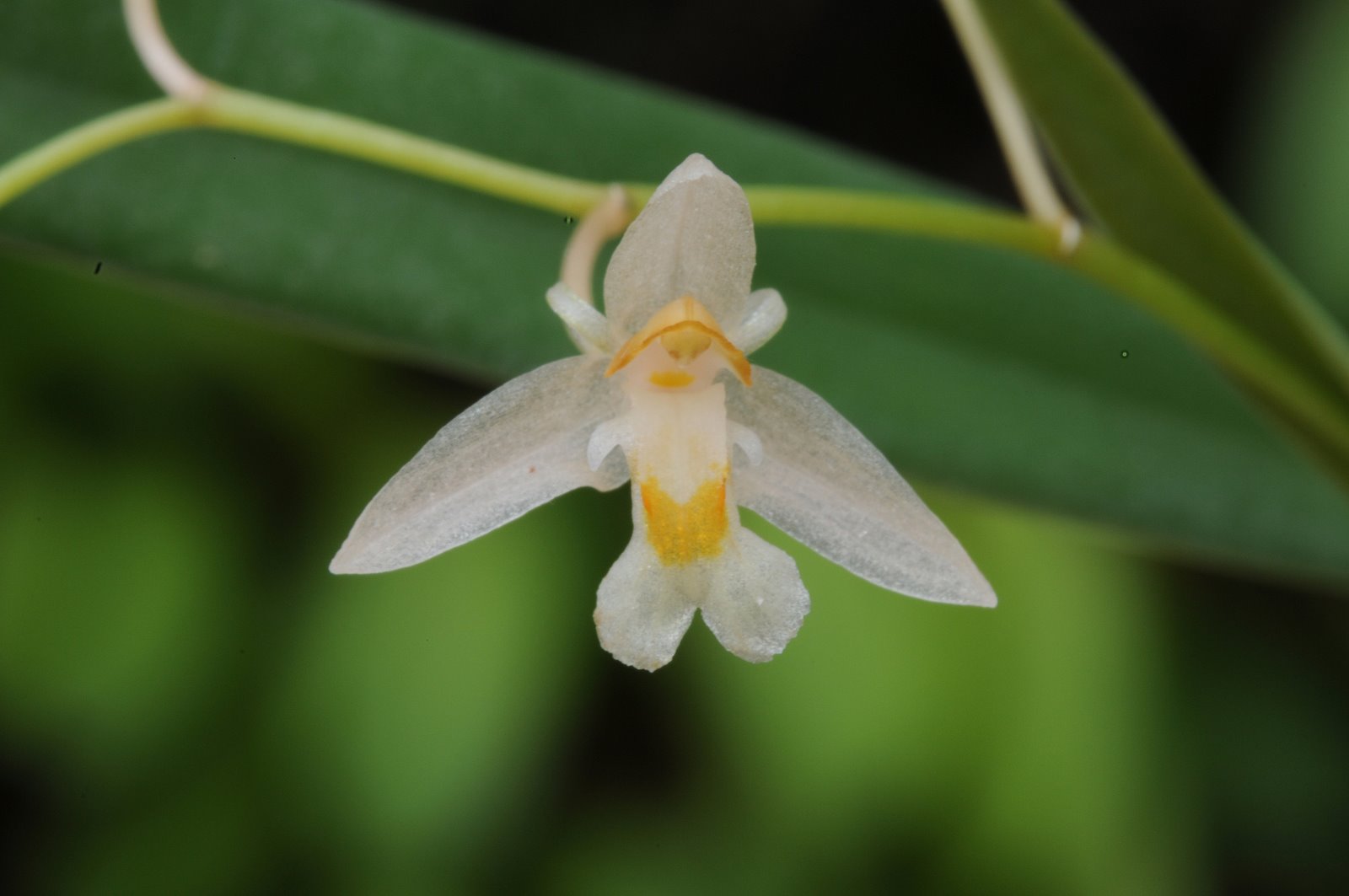 Found in Sarawak, Sabah and Kalimantan Borneo on forest ridges in lower montane riverine forests at elevations of 1200 to 1500 meters as a miniature to small sized, cool growing epiphyte with narrowly cylindrical, recurved pseudobulbs becoming longitudinally sulcate with age and carrying a single, apical, erect, coriaceous, ovate-lanceolate to linear-lanceolate, acute, plicate, 3 nerved, midrib below fairly prominent, gradually narrowing below into the petiolate base leaf that blooms in the fall on a synanthous, on half way developed pseudobulbs, 3 to 4.8" [7 to 12 cm] long, wiry, erect, 3 to 8 flowered inflorescence.
